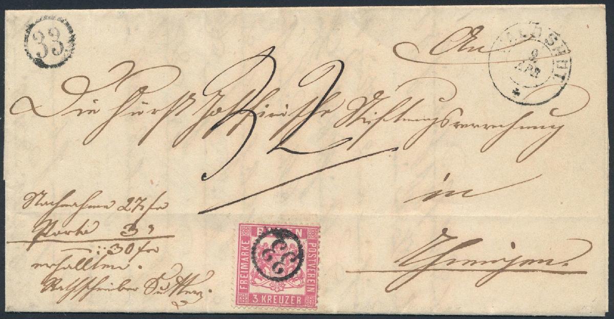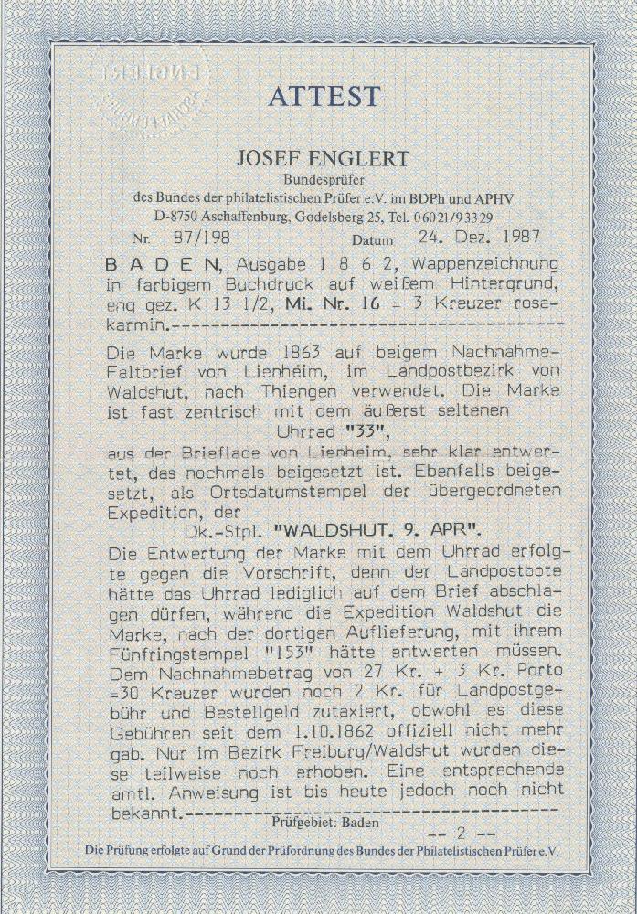 | Zusatzinformationen und Suchstichworte: | Wohlfeil 85. Auktion 16. - 17. Juni 2023 Los 2106 Altdeutschland Baden Uhrrad Stempel 33 (Lienheim), zentr. Entwerter auf 3 Kr. rosakarmin und nochmals beiges. auf Kabinett-Nachnahmebrief 1863 mit Neben-K2 "Waldshut 9. Apr." nach Thiengen, äußerst seltener Beleg, wobei bei der Nachnahme-Taxierung fälschlicherweise noch 2 Kr. für Landpostgebühr und Bestellgeld zutaxiert wurde (gab es seit 1.10.1862 nicht mehr), ausführliches Attest Englert Zuschlag 1.200,00 EUR |
