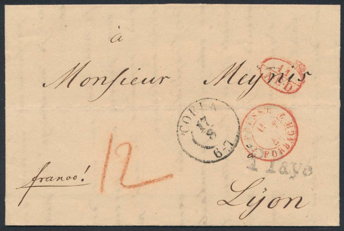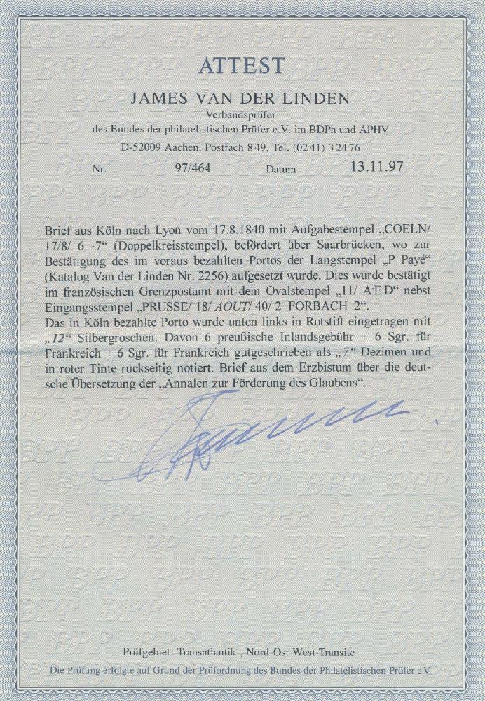 | Zusatzinformationen und Suchstichworte: | Wohlfeil 85. Auktion 16. - 17. Juni 2023 Los 2836 Altdeutschland Preussen Coeln K2 nebst rotem Ovalstpl. "11 A.E.D" und L1 "P. Paye" (Van der Linden Nr. 2256) auf Brief 1840 nach Lyon, Attest van der Linden Ausruf 80,00 EUR |