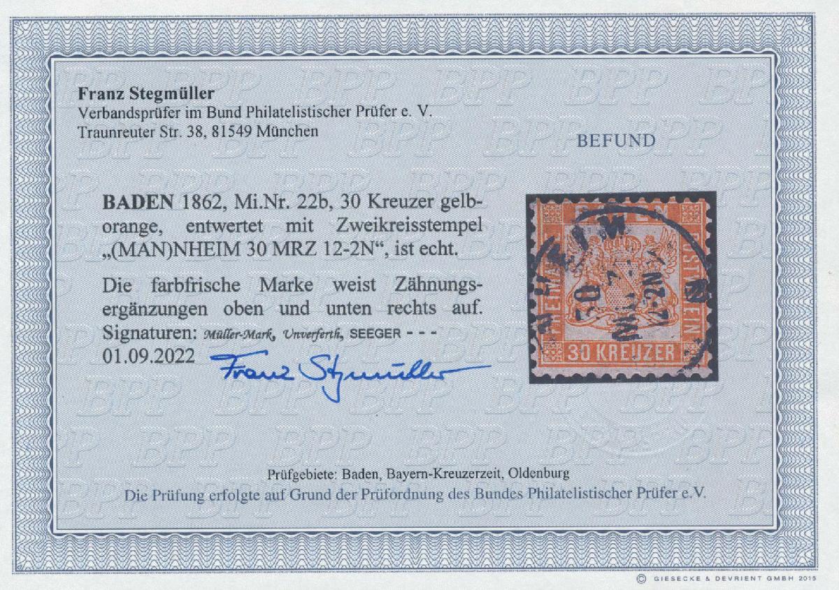 | Zusatzinformationen und Suchstichworte: | Wohlfeil 85. Auktion 16. - 17. Juni 2023 Los 71 Altdeutschland Baden MANNHEIM 30.MRZ., voller K 2 a.30 Kreuzer, lt.Fotobefund BPP STEGMÜLLER " Stempel echt, die farbfrische Marke weist z.T.Zähnungsergänzungen auf " Ausruf 200,00 EUR |