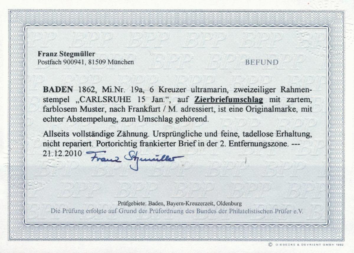 | Zusatzinformationen und Suchstichworte: | Wohlfeil 85. Auktion 16. - 17. Juni 2023 Los 1351 Altdeutschland Baden 6 Kr. ultramarin mit Ra2 "Carlsruhe" auf Kab. Zierbriefumschlag mit zartem farblosem Rankenmuster nach Frankfurt/M., Befund Stegmüller Ausruf 120,00 EUR |