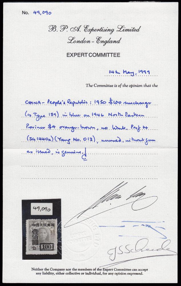 | Zusatzinformationen und Suchstichworte: | D&T International AB - Auktion 2023-1 17. - 18. Juni 2023 Los 189 China VR Michel40 I Scott40 a (generiert) Yvert887 prem.planch 1950 Mi:40 I, SG:1440a Surchage on DR Sun Yat-sen $10/$4 on 1st Central Print, with 1999 Expert Certificate Zuschlag 2.600,00 SEK |