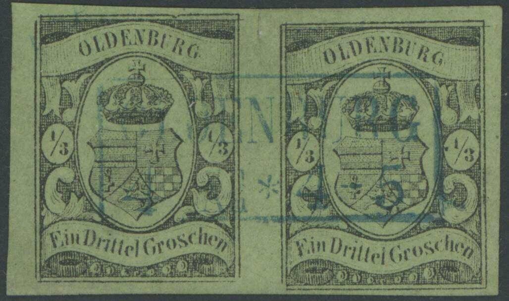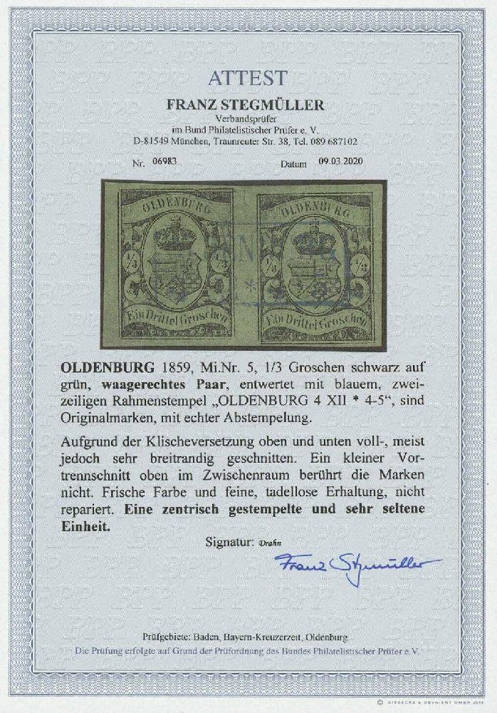 | Zusatzinformationen und Suchstichworte: | Ulrich Felzmann 178. Auktion 22. Juni 2023 Los 2576 Altdeutschland Oldenburg 1/3 Gr auf grün im waagerechten Kabinett-Paar mit markantem Klischee-Versatz, herrlich farbfrisch und ringsum voll- bis sehr breitrandig mit kleinem Vortrennschnitt lediglich im oberen Zwischenraum, wunderschön entwertet mit absolut zentrisch, klar und gerade aufsitzendem Ra2 OLDENBURG 4 XII * 4-5 in außergewöhnlich attraktiver Top-Erhaltung, sign. Drahn sowie Fotoattest Stegmüller BPP "Eine zentrisch gestempelte und sehr seltene Einheit" Ausruf 10.000,00 EUR |