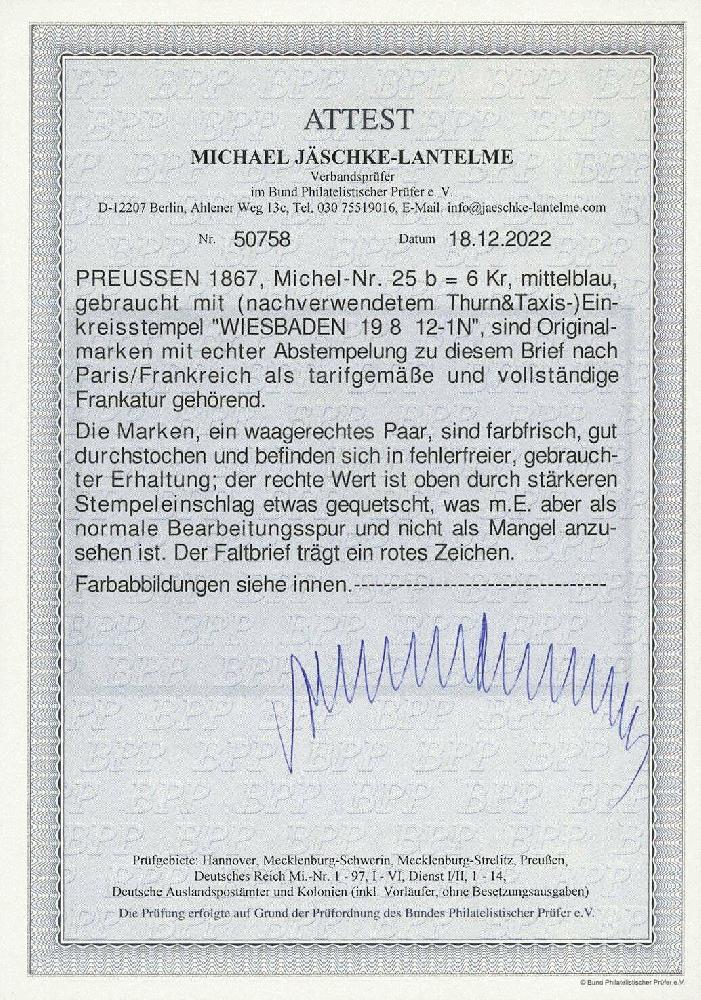 | Zusatzinformationen und Suchstichworte: | Ulrich Felzmann 178. Auktion 22. Juni 2023 Los 2608 Altdeutschland Preussen 6 Kr mittelblau, waagerechtes Paar mit allseits tadellosem Durchstich, tarifgerechte Mehrfachfrankatur auf Auslandsbrief WIESBADEN 19 8 (1867) nach Paris/Frankreich, der Ordnung halber sei eine Quetschung der rechten Marke oben durch starken Stempeleinschlag erwähnt, gemäß Fotoattest Jäschke-L. BPP verwendungsbedingt, insofern kein Mangel, ergo "in fehlerfreier, gebrauchter Erhaltung" Ausruf 1.000,00 EUR |