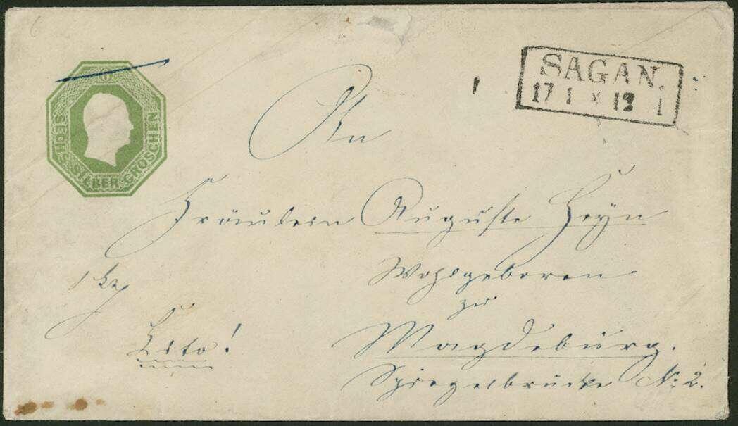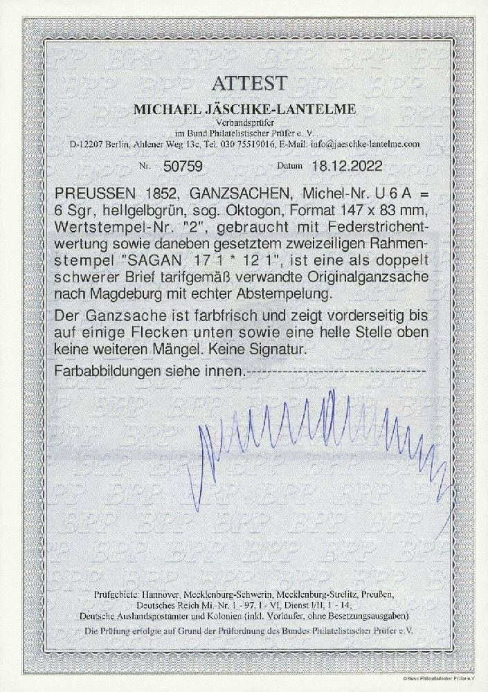 | Zusatzinformationen und Suchstichworte: | Ulrich Felzmann 178. Auktion 22. Juni Los 2610 Altdeutschland Preussen 6 Sgr Okotogon hellgelbgrün, Kleinformat mit Wertstempel Nr. "2", in der 2. Gewichtsstufe von SAGAN 17 1 nach Mangeburg gelaufen, farbfrische, bis auf einige vorderseitige Fleckchen unten sowie eine helle Stelle oben gute Erhaltung, Fotoattest Jäschke-L. BPP, € 1.100,-2023 Ausruf 200,00 EUR |