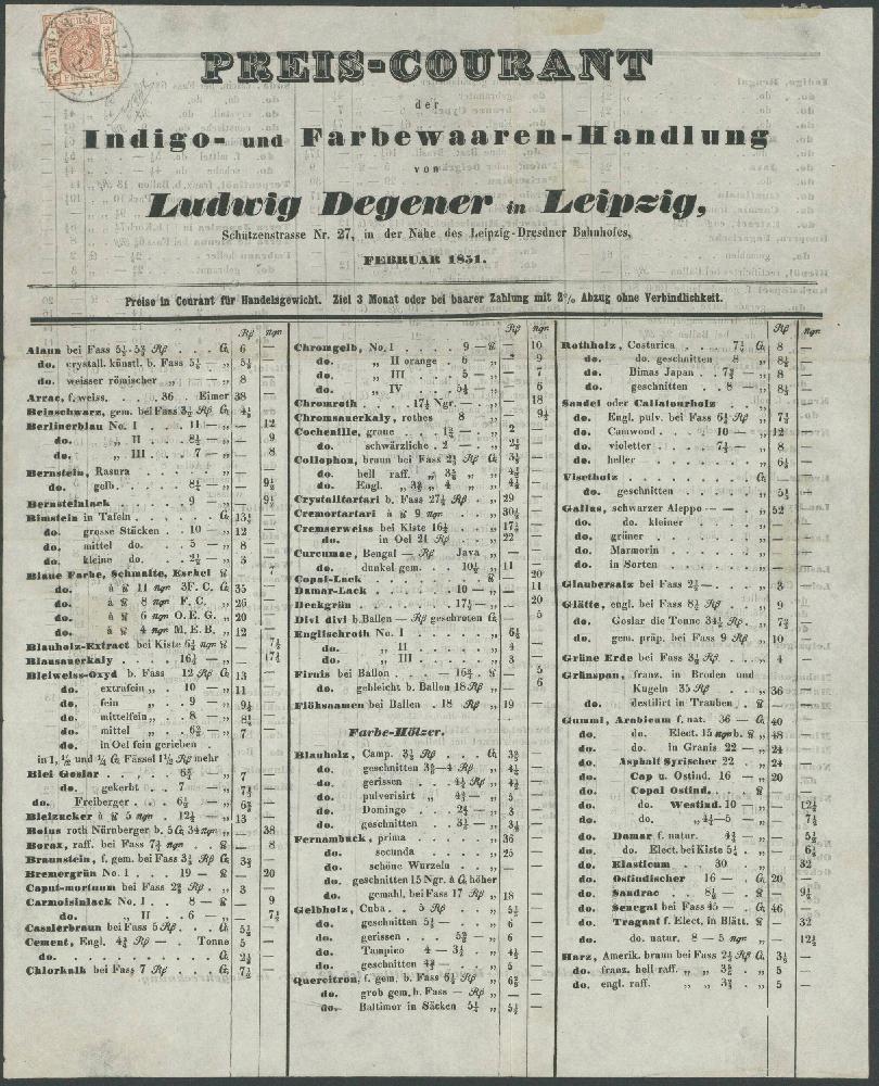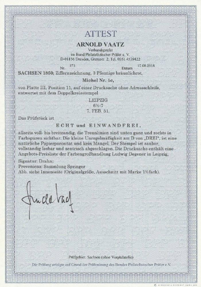 | Zusatzinformationen und Suchstichworte: | Ulrich Felzmann 178. Auktion 22. Juni 2023 Los 2619 Altdeutschland Sachsen 3 Pfge bräunlichrot, Platte III, Type 11, farbfrisch und ringsum voll- bis breitrandig mit wunderschön zentrisch und sauber aufsitzendem K2 LEIPZIG 7. FEB. 51 auf vollständiger Drucksache ohne Adressschleife, erstklassig erhaltene Preisliste der "Indigo- und Farbwaaren-Handlung von Ludwig Degener" in phantastisch frischer, völlig ursprünglicher Luxus-Qualität! Sign. Drahn sowie Fotoattest Vaatz BPP "... einwandfrei" - Sicherlich eines der wirkungsvollsten Belegstücke der ohnehin seltenen braunroten Nuance, ex Springer Ausruf 25.000,00 EUR |