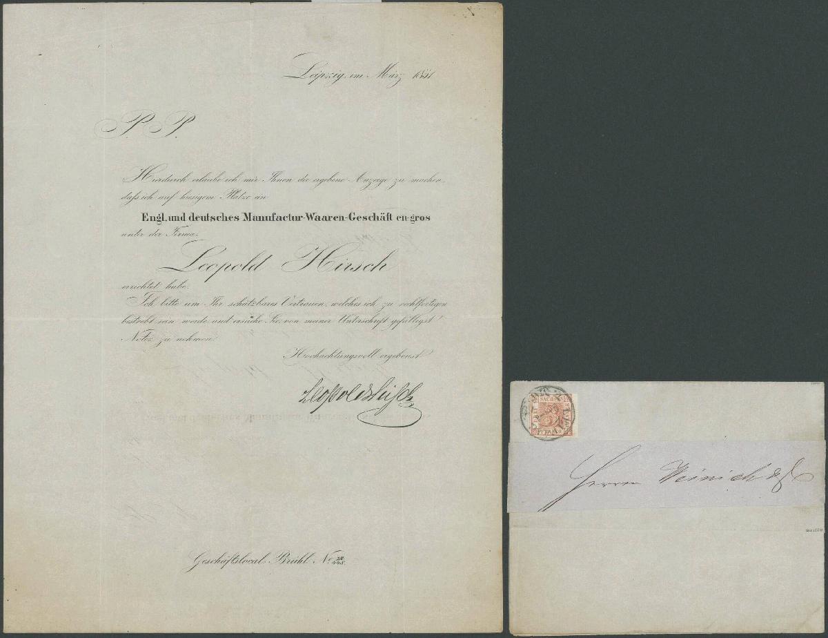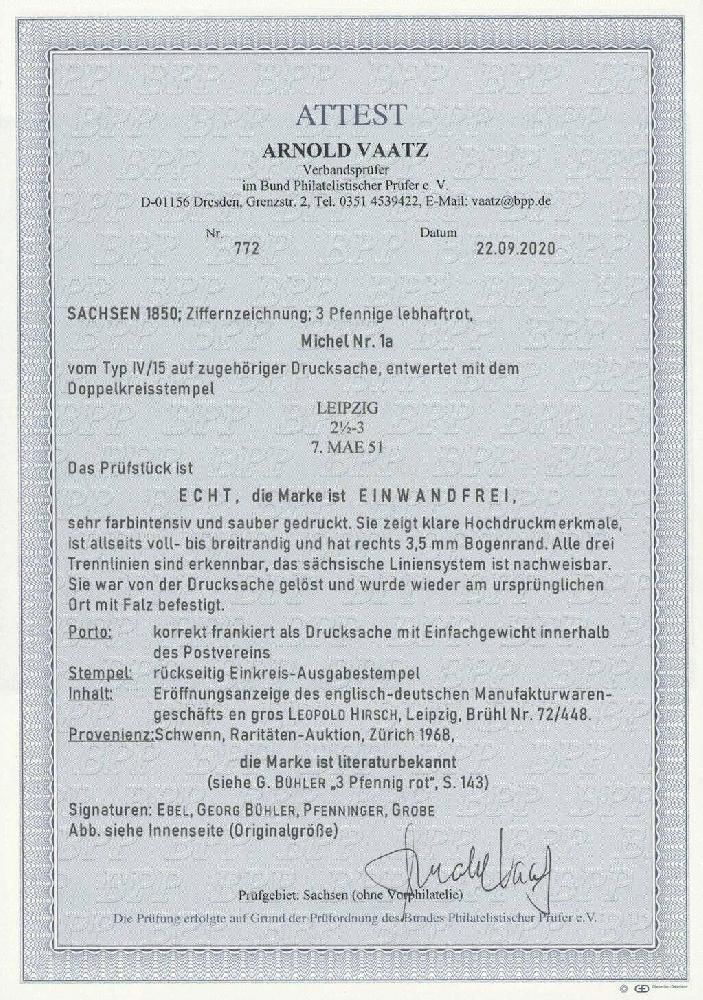| Zusatzinformationen und Suchstichworte: | Ulrich Felzmann 178. Auktion 22. Juni 2023 Los 2620 Altdeutschland Sachsen 3 Pfge lebhaftrot, Platte IV, Type 15, ringsum tadellos voll- bis überrandig mit rechtsseitig 2,5 mm breitem Bogenrand (!) und dreiseitig sichtbaren Schnittlinien, wodurch das sächsische Liniensystem klar erkennbar ist, mit voll aufsitzendem K2 LEIPZIG 7. MAE. 51 auf zugehöriger Drucksache mit Adressschleife, zu Prüfzwecken gelöst und mit Falz an ursprünglicher Position fixiert, sehr attraktive Eröffnungsanzeige des Engl. und deutschen Manufactur-Waaren-Geschäfts Leopold Hirsch. Literaturbekanntes Spitzenstück in weit überdurchschnittlicher Liebhabererhaltung, siehe Georg Bühlers Standardwerk "3 Pfennig rot", Seite 143, vielfach signiert sowie Fotoattest Vaatz BPP "... einwandfrei" Ausruf 14.000,00 EUR |