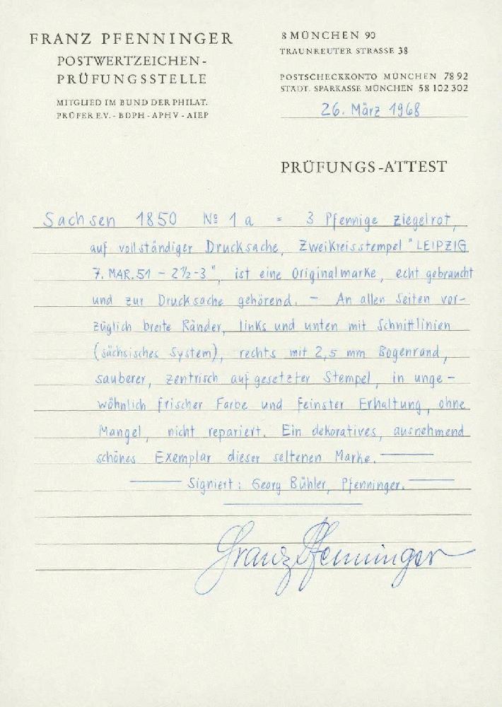 | Zusatzinformationen und Suchstichworte: | Ulrich Felzmann 178. Auktion 22. Juni 2023 Los 2620 Altdeutschland Sachsen 3 Pfge lebhaftrot, Platte IV, Type 15, ringsum tadellos voll- bis überrandig mit rechtsseitig 2,5 mm breitem Bogenrand (!) und dreiseitig sichtbaren Schnittlinien, wodurch das sächsische Liniensystem klar erkennbar ist, mit voll aufsitzendem K2 LEIPZIG 7. MAE. 51 auf zugehöriger Drucksache mit Adressschleife, zu Prüfzwecken gelöst und mit Falz an ursprünglicher Position fixiert, sehr attraktive Eröffnungsanzeige des Engl. und deutschen Manufactur-Waaren-Geschäfts Leopold Hirsch. Literaturbekanntes Spitzenstück in weit überdurchschnittlicher Liebhabererhaltung, siehe Georg Bühlers Standardwerk "3 Pfennig rot", Seite 143, vielfach signiert sowie Fotoattest Vaatz BPP "... einwandfrei" Ausruf 14.000,00 EUR |