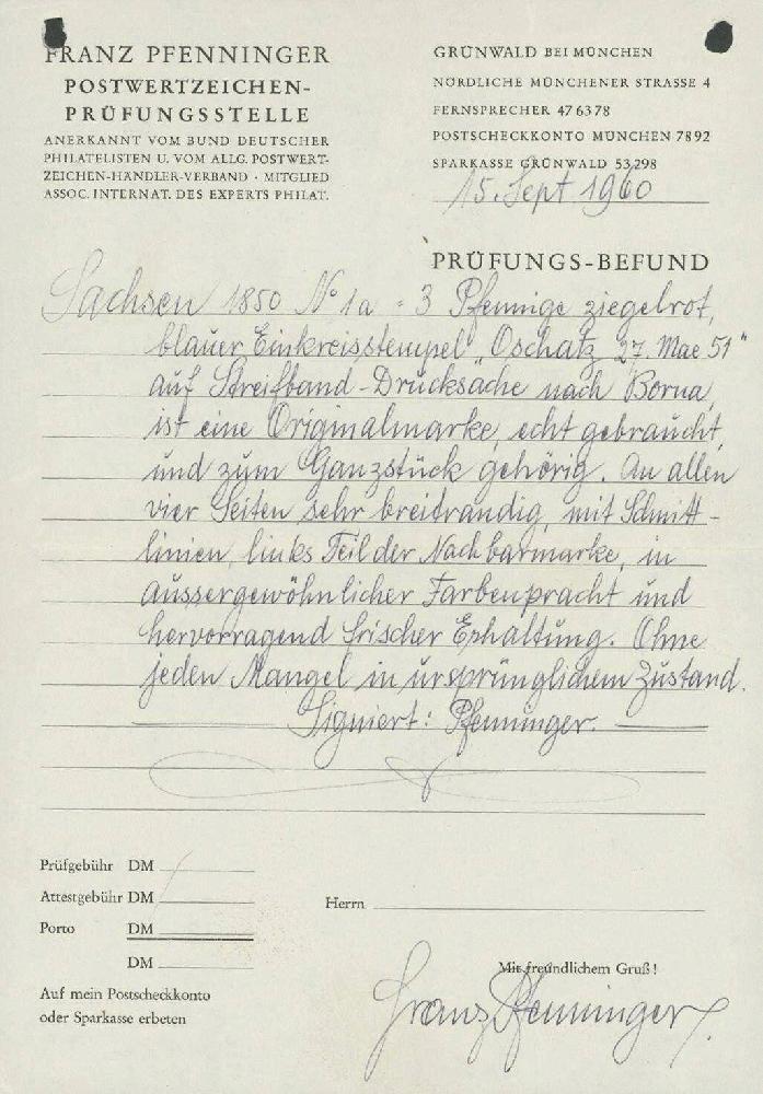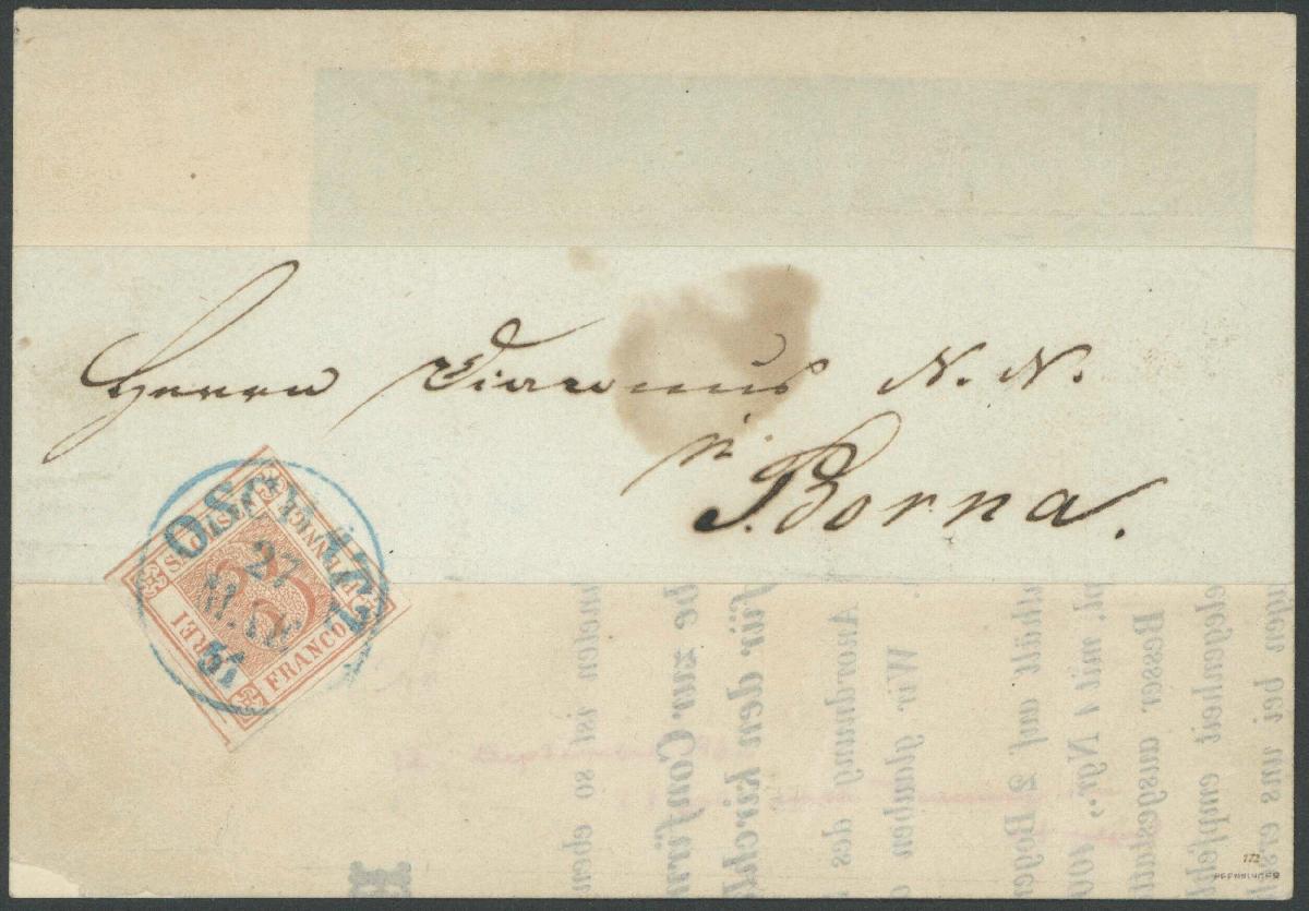 | Zusatzinformationen und Suchstichworte: | Ulrich Felzmann 178. Auktion 22. Juni 2023 Los 2621 Altdeutschland Sachsen 3 Pfge in seltener orangeroter Nuance, Platte V, Type 7, ringsum voll- bis überrandig mit Teilen aller 4 Schnittlinien - oben und links vollständig inklusive Teil der linken Nachbarmarke, das sächsische Liniensystem ist klar erkennbar! - mit ideal zentrisch und hervorragend klar abgeschlagenem blauem K1 OSCHATZ 27 MAE. 51 auf Vorderseite einer Streifbandsendung mit vollständigem Adressteil nach Borna. Altbekannte Sachsen-Rarität 1. Ranges und ausgesprochenes Liebhaberstück, Fotoatteste Pfenninger (1960) "... in außergewöhnlicher Farbenpracht ..." sowie Rismondo BPP (2011) "Farbfrisches, besonders schönes Stück dieser Marke in einwandfreier Erhaltung!" Eines der Spitzenstücke der 170. Köhler-Versteigerung im Jahre 1962, mit auf dieser Marke sehr seltenem blauem Einkreisstempel Oschatz! Ausruf 18.000,00 EUR |
