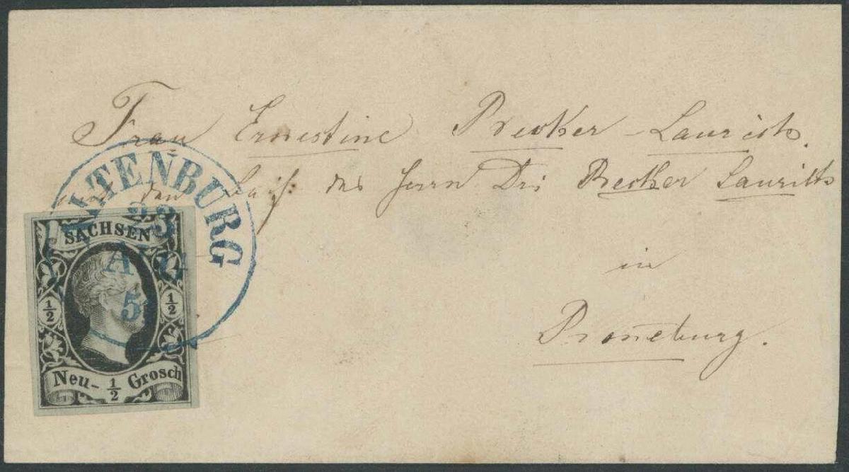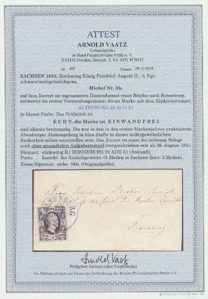 | Zusatzinformationen und Suchstichworte: | Ulrich Felzmann 178. Auktion 22. Juni 2023 Los 2622 Altdeutschland Sachsen ALTENBURG 23 AUG 51, blauer K1 ideal klar und übergehend auf kleinformatiger, rs. gesiegelter Damen-Faltbriefhülle mit ½ Ngr Friedrich August auf mattgrünlichgrau, noch im ersten Verwendungsmonat (!) ohne den erst ab 30. August vorgeschriebenen, gesonderten Aufgabestempel! Farbfrisch und ringsum breitrandig in unübertrefflicher Qualität und Optik, nach Ronneburg mit rs. Ankunft am selben Tag, Fotoattest Vaatz BPP "... einwandfrei" Ausruf 1.200,00 EUR |