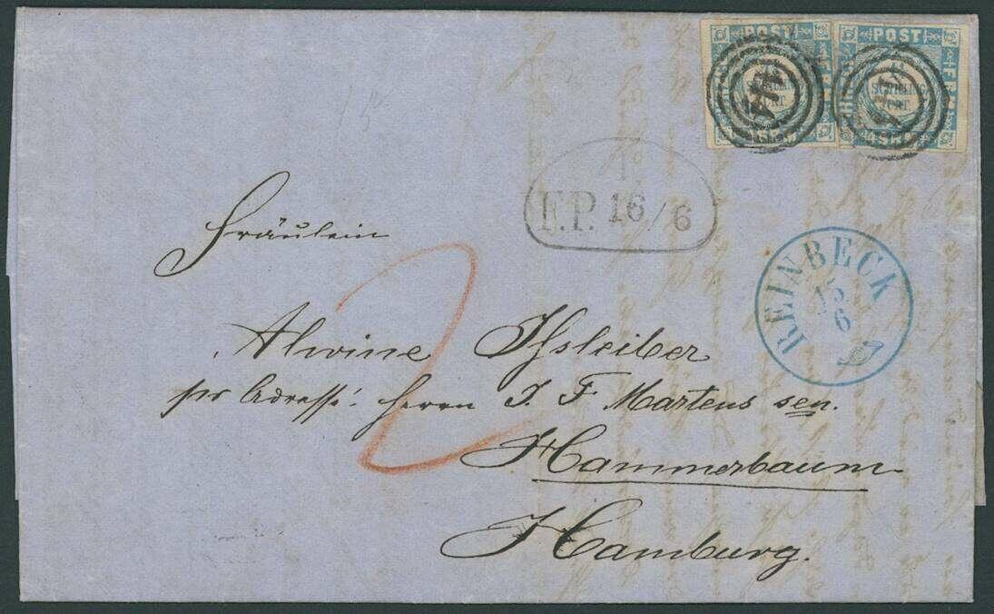 | Zusatzinformationen und Suchstichworte: | Ulrich Felzmann 178. Auktion 22. Juni 2023 Los 2633 Altdeutschland Schleswig Holstein 144 - REINBECK 15 6 (1864), jeweils zentrisch und klar auf 2 etwas fehlerhaft verklebten Einzelstücken 1¼ S auf vollständigem, mittig gefaltetem Faltbrief der 2. Gewichtsstufe, nach Hamburg mit vs. Fußpoststempel F.P. 16/6 sowie rs. Ankunft 16.6., Fotoattest Møller BPP Ausruf 150,00 EUR |