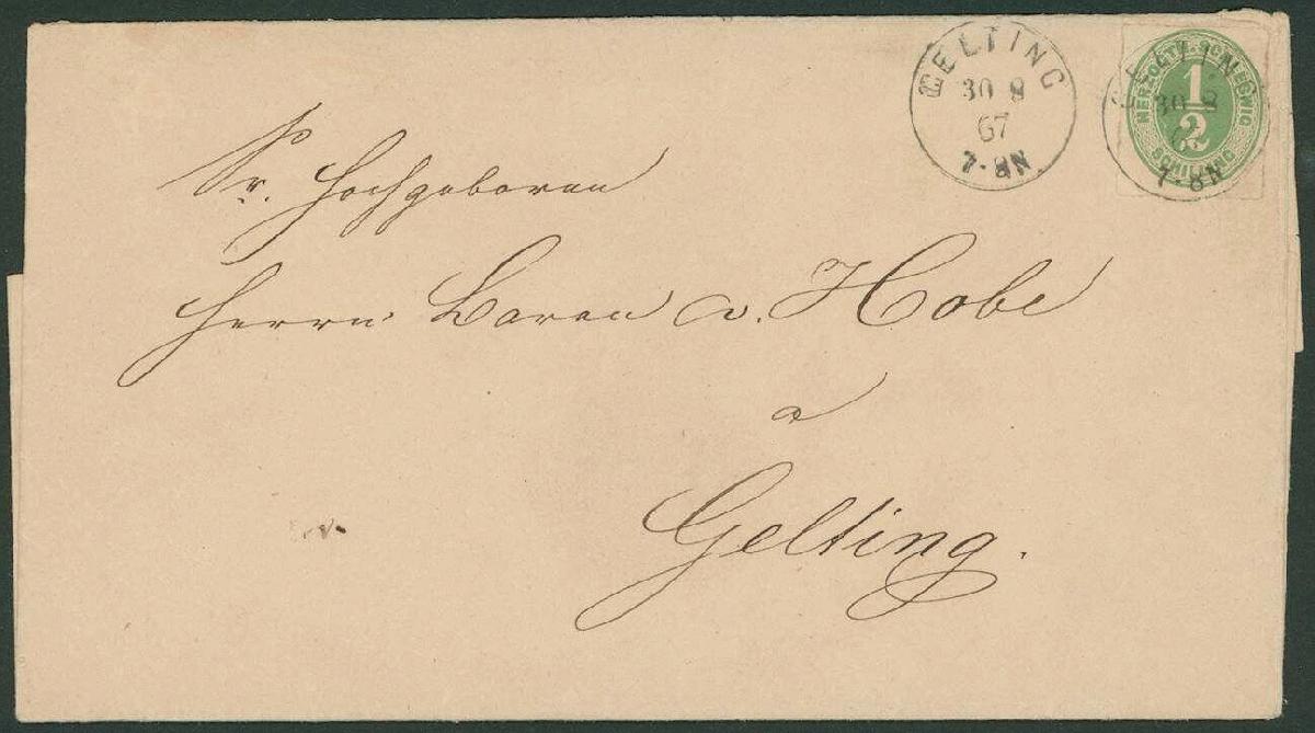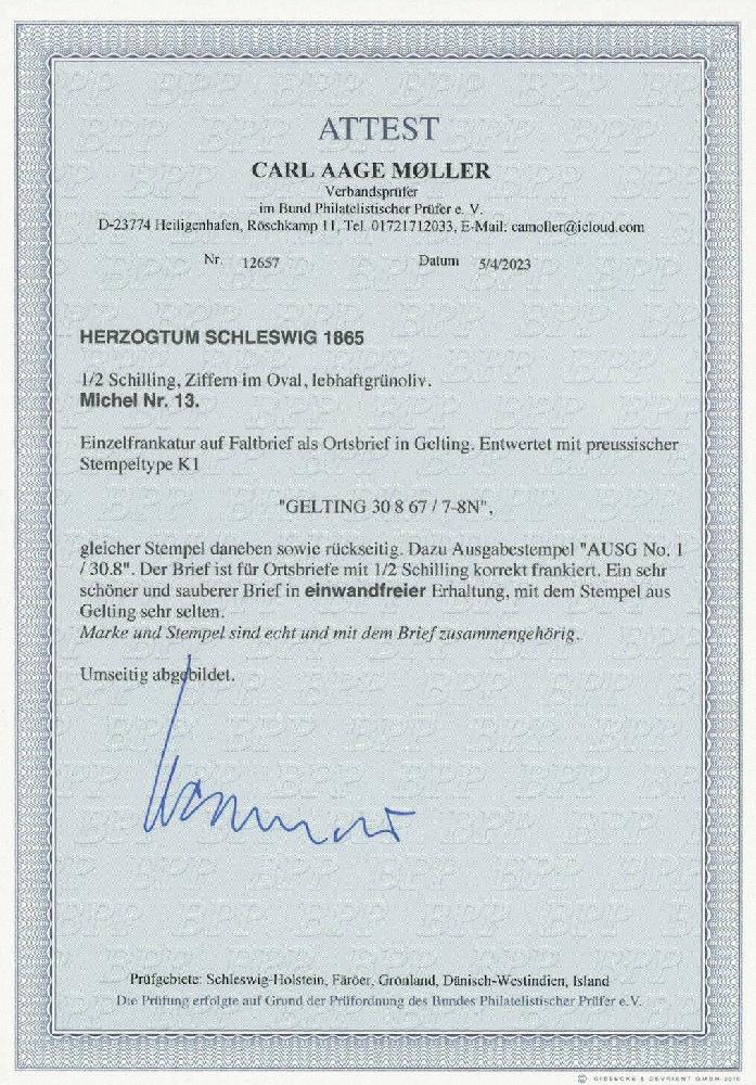 | Zusatzinformationen und Suchstichworte: | Ulrich Felzmann 178. Auktion 22. Juni 2023 Los 2640 Altdeutschland Schleswig Holstein ½ S lebhaftgrünoliv, farbfrisch mit tadellos gelungener Durchstichtrennung und zentrisch, klar und gerade aufsitzendem K1 GELTING 30 8 67 in tarifrichtiger Einzelfrankatur auf völlig ursprünglicher Orts-Faltbriefhülle, rs. gut erhaltenes rotes Lacksiegel, Ankunft sowie Ausg. No. 1 am selben Tag, Fotoattest Møller BPP "... in einwandfreier Erhaltung, mit dem Stempel aus Gelting sehr selten" Ausruf 150,00 EUR |