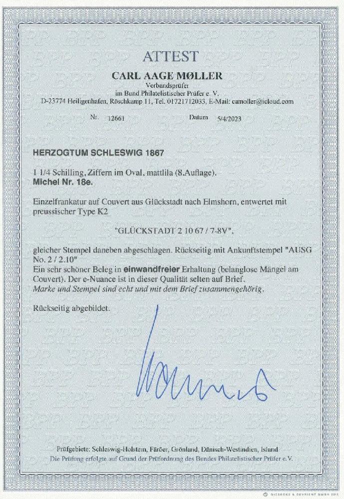 | Zusatzinformationen und Suchstichworte: | Ulrich Felzmann 178. Auktion 22. Juni 2023 Los 2644 Altdeutschland Schleswig Holstein 1¼ S mattlila, farbfrisch mit tadellos gelungener Durchstichtrennung, etwas über den Rand geklebt mit sauber aufsitzendem K2 GLÜCKSTADT 2 10 67 in tarifrichtiger Einzelfrankatur auf ursprünglich patiniertem, sehr hübschem Damen-Kuvert nach Elmshorn mit rs. Ausg. am selben Tag, Fotoattest Møller BPP "... in dieser Qualität selten auf Brief" Ausruf 150,00 EUR |