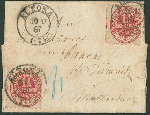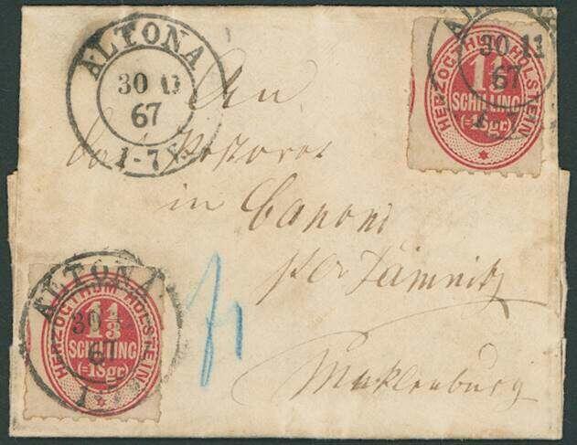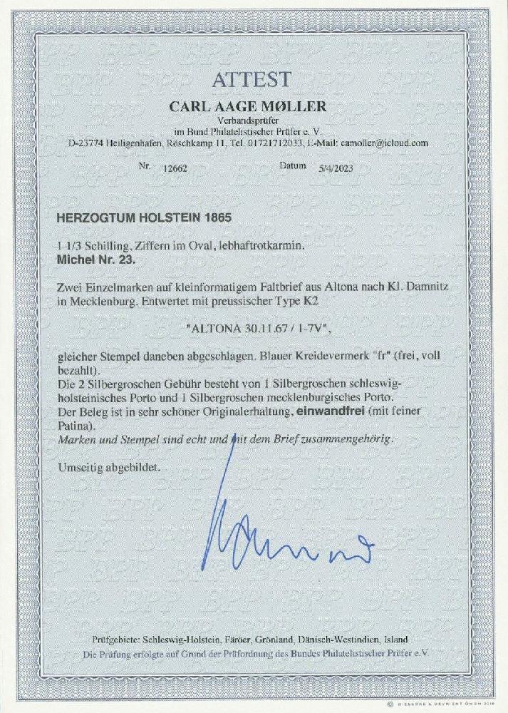 | Zusatzinformationen und Suchstichworte: | Ulrich Felzmann 178. Auktion 22. Juni 2023 Los 2645 Altdeutschland Schleswig Holstein 1 Sgr lebhaftrotkarmin, 2 farbfrische Exemplare mit gut gelungener Durchstichtrennung tarifrichtig auf vollständigem Postvereins-Faltbrief ALTONA 30 11 67 nach Canow in Mecklenburg-Strelitz, ursprünglich patiniertes, entzückendes kleinformatiges Brieflein dieser eher seltenen Destination, Fotoattest Møller BPP "... einwandfrei ..." Ausruf 150,00 EUR |