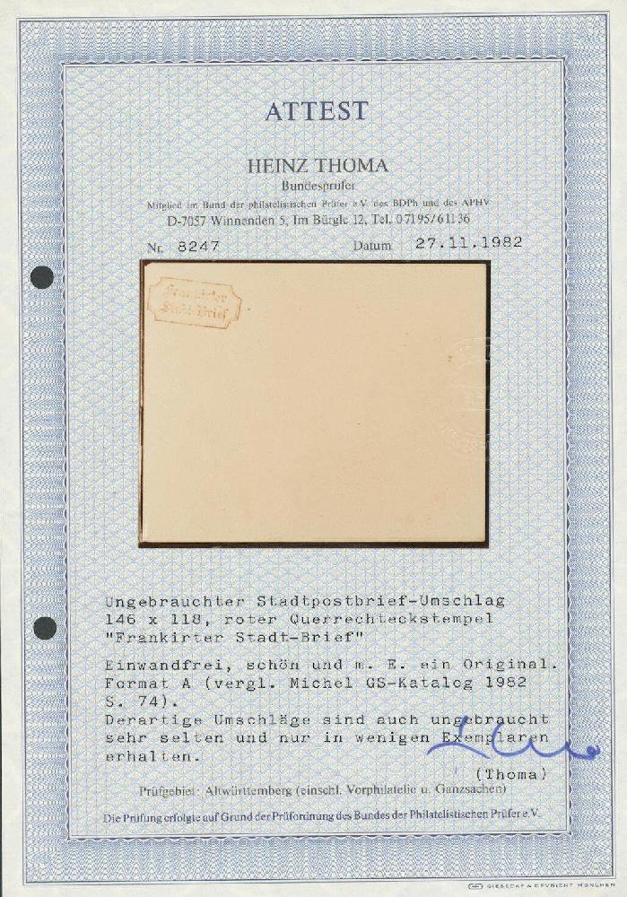 | Zusatzinformationen und Suchstichworte: | Ulrich Felzmann 178. Auktion 22. Juni 2023 Los 2668 Altdeutschland Thurn und Taxis FRANKIRTER STADT-BRIEF im großen Format 146 x 118 mm mit rotem Handstempel als Vorläufer der Ganzsachen, sauber ungebraucht, Pracht, Fotoattest Thoma BPP "... auch ungebraucht sehr selten und nur in wenigen Exemplaren erhalten" Ausruf 250,00 EUR |