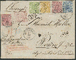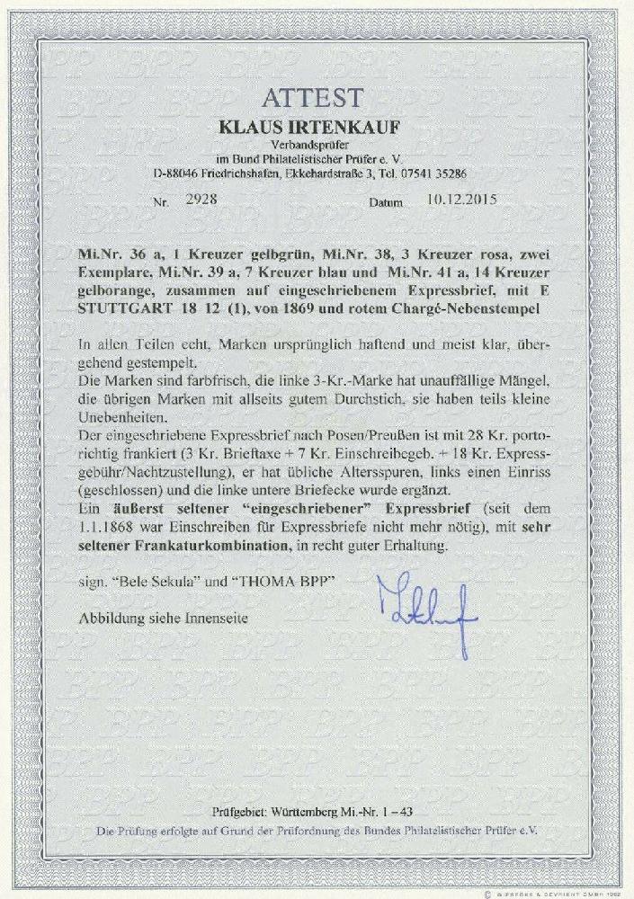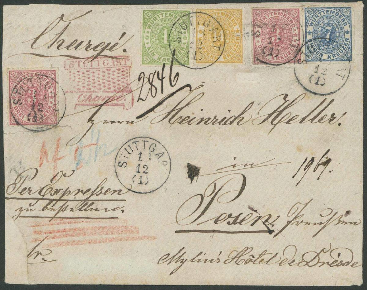 | Zusatzinformationen und Suchstichworte: | Ulrich Felzmann 178. Auktion 22. Juni 2023 Los 2671 Altdeutschland Württemberg 14 Kr gelborange zusammen mit 1 Kr gelbgrün, 2x 3 Kr rosa sowie 7 Kr blau auf zweiseitig offenem, gering lädiertem Chargé-Express-Brief STUTTGART 18 12 (1869) nach Posen/Preußen, alle Marken dieser tarifrichtigen, spektakulären Vierfarbenfrankatur (!) haften ursprünglich in meist tadelloser Qualität, sind farbfrisch und sauber entwertet! Sign. Bela Sekula sowie Fotoatteste Thoma BPP "... sehr selten ... ganz ausgefallene Frankatur" sowie Irtenkauf BPP "... äußerst seltener `eingeschriebener` Expressbrief ... mit sehr seltener Frankaturkombination ..." - Seit dem 1.1.1868 war Einschreiben für Expressbriefe nicht mehr nötig Ausruf 5.000,00 EUR |