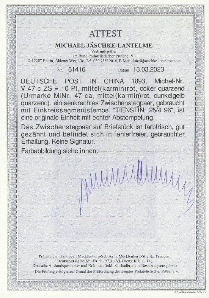 | Zusatzinformationen und Suchstichworte: | Ulrich Felzmann 178. Auktion 22. Juni 2023 Los 2896 Deutsche Auslandspost China, Vorläufer TIENTSIN 25/4 96, ideal zentrischer Luxus-Abschlag auf senkrechtem Zwischenstegpaar (!) 10 Pfg Krone/Adler mittelrot, ocker quarzend, in dieser Form eine äußerst seltene Variante, herrlich farbfrisch und gut gezähnt in fehlerfreier Ausnahme-Qualität, Fotoattest Jäschke-L. BPP Ausruf 700,00 EUR |