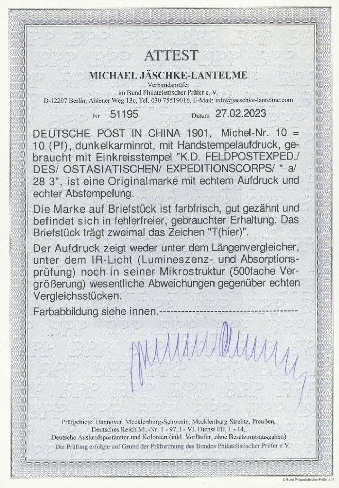 | Zusatzinformationen und Suchstichworte: | Ulrich Felzmann 178. Auktion 22. Juni 2023 Los 2898 Deutsche Auslandspost China 10 Pfg Germania/Handstempelaufdruck mit zentrisch zeitgerecht aufsitzendem Stempel K.D. FELDPOSTEXPED. DES OSTASIATISCHEN EXPEDITIONSCORPS *a 28 3 auf kleinem Kabinett-Briefstück, farbfrisch und gut gezähnt in völlig fehlerfreier Erhaltung, sign. Thier sowie Fotoattest Jäschke-L. BPP Ausruf 500,00 EUR |