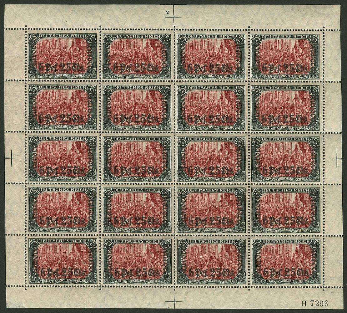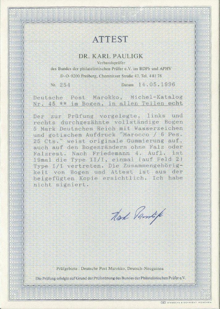 | Zusatzinformationen und Suchstichworte: | Ulrich Felzmann 178. Auktion 22. Juni 2023 Los 2904 Deutsche Auslandspost Marokko 6 P 25 C Deutsches Reich mit Wz., HAN 7293, im kompletten Originalbogen zu 20 Marken, tadellos postfrisch einschließlich der Bogenränder, unsigniert, Fotoatteste Steuer und Pauligk BPP "... einwandfrei" Ausruf 2.000,00 EUR |