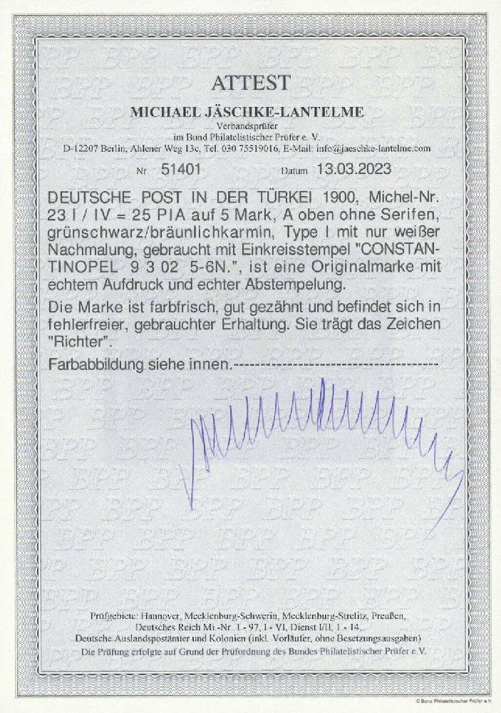 | Zusatzinformationen und Suchstichworte: | Ulrich Felzmann 178. Auktion 22. Juni 2023 Los 2911 Deutsche Auslandspost Türkei 25 PIA auf 5 Mk Reichspost mit nur weißer Nachmalung, farbfrisch und gut gezähnt mit nur einem einzigem Stempel CONSTANTINOPEL 9 3 02 in fehlerfreier Kabinetterhaltung, sign. Richter sowie Fotoatteste Steuer und Jäschke-L. BPP, € 650,- Ausruf 200,00 EUR |