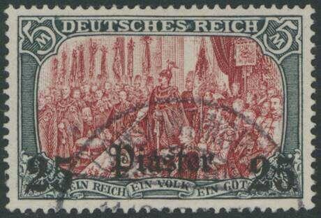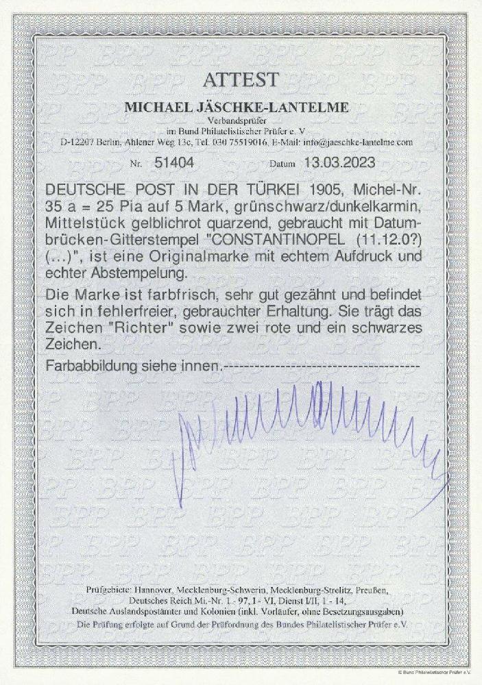 | Zusatzinformationen und Suchstichworte: | Ulrich Felzmann 178. Auktion 22. Juni 2023 Los 2919 Deutsche Auslandspost Türkei 25 Pia auf 5 Mk Deutsches Reich ohne Wz., farbfrisch und sehr gut gezähnt mit klarem Teilstempel CONSTANTINOPEL in fehlerfreier Prachterhaltung, u.a. sign. Richter sowie Fotoattest Jäschke-L. BPP, € 700,- Ausruf 200,00 EUR |