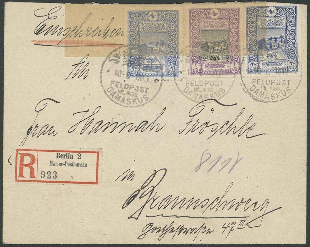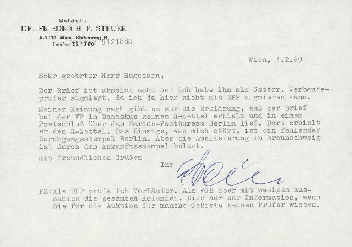 | Zusatzinformationen und Suchstichworte: | Ulrich Felzmann 178. Auktion 22. Juni 2023 Los 2923 Deutsche Auslandspost Türkei - Deutsche Militärmission Türkei MIL. MISS. DAMASKUS 10.8.17, frankierter R-Brief nach Braunschweig mit Militär-Zensurbanderole "Berlin C2, den 30. Aug. 1917" und rs. Ankunft 30.8.17, eine Marke Öffnungsfehler, bemerkenswert mit in Berlin nachgeklebtem R-Zettel "Marine-Postbureau", zudem sehr attraktiv in ursprünglich frischer Erhaltung, doppelt sign. Dr. Steuer Ausruf 300,00 EUR |