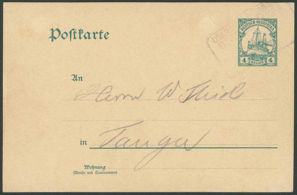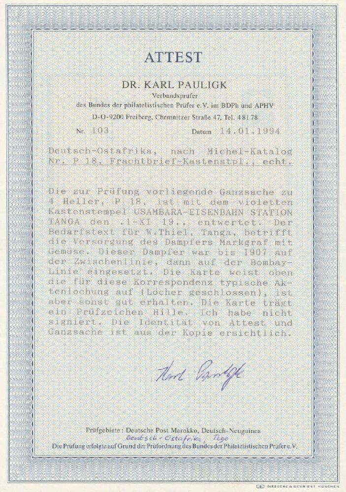 | Zusatzinformationen und Suchstichworte: | Ulrich Felzmann 178. Auktion 22. Juni 2023 Los 2932 Deutsche Kolonien Ostafrika USAMBARA EISENBAHN STATION TANGA, violetter Frachtbrief-Kastenstempel etwas schwach, jedoch voll und rein bedarfsmäßig aushilfsweise auf 4 H GSK mit interessantem Text bezüglich Versorgung des Dampfers "Markgraf", der "... mehrere Tage zu früh kommen soll ...", Aktenlochung geschlossen, darüber hinaus einwandfrei und völlig ursprünglich, sign. Hille sowie Fotoattest Pauligk BPP Ausruf 200,00 EUR |