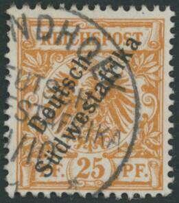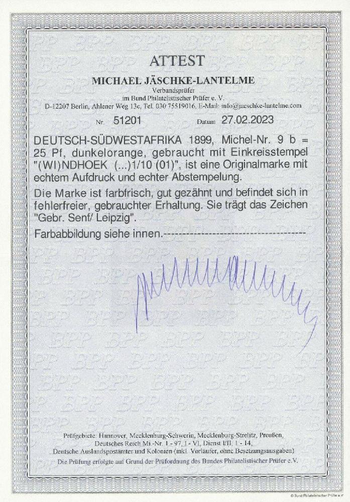 | Zusatzinformationen und Suchstichworte: | Ulrich Felzmann 178. Auktion 22. Juni 2023 Los 2937 Deutsche Kolonien Südwestafrika 25 Pfg Krone/Adler dunkelorange mit klar aufsitzendem Stempel WINDHOEK in fehlerfreier Prachterhaltung, farbfrisch und gut gezähnt, sign. Senf sowie Fotoattest Jäschke-L. BPP, € 550,- Ausruf 200,00 EUR |