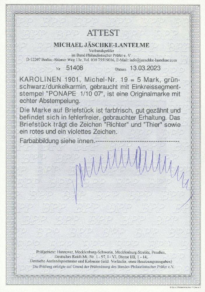 | Zusatzinformationen und Suchstichworte: | Ulrich Felzmann 178. Auktion 22. Juni 2023 Los 2958 Deutsche Kolonien Karolinen 5 Mk Kaiseryacht sauber gestempelt PONAPE 1/10 07 auf kleinem Briefstück, farbfrisch und gut gezähnt in fehlerfreier Prachterhaltung, u.a. sign. Thier sowie Fotoattest Jäschke-L. BPP, € 600,- Ausruf 150,00 EUR |