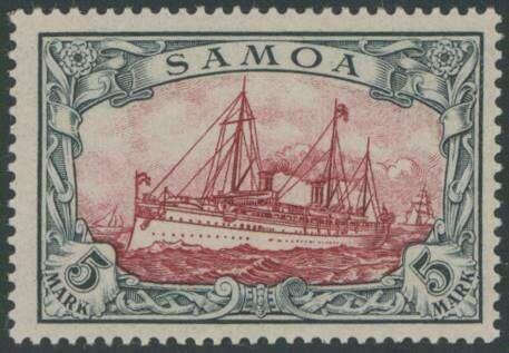 | Zusatzinformationen und Suchstichworte: | Ulrich Felzmann 178. Auktion 22. Juni 2023 Los 2968 Deutsche Kolonien Samoa 5 Mk Kaiseryacht in postfrischer Luxuserhaltung, ausgesprochen farbfrisch mit auch blütenweißer Gummierung und sehr gut gezähnt in fehlerfreier Ausnahme-Erhaltung, sign. Ebel sowie Fotoattest Jäschke-L. BPP, € 850,- Ausruf 250,00 EUR |