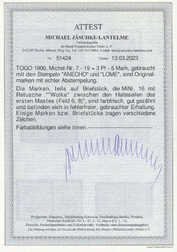 | Zusatzinformationen und Suchstichworte: | Ulrich Felzmann 178. Auktion 22. Juni 2023 Los 2971 Deutsche Kolonien Togo 3 Pfg bis 5 Mk Kaiseryacht komplett gestempelt ANECHO bzw. LOME in ausgesuchter, fehlerfreier Prachterhaltung, sämtliche Marken farbfrisch und gut gezähnt, teils auf Briefstück, darunter 1 MK mit "Wolkenretusche", Fotoattest Jäschke-L. BPP Ausruf 300,00 EUR |