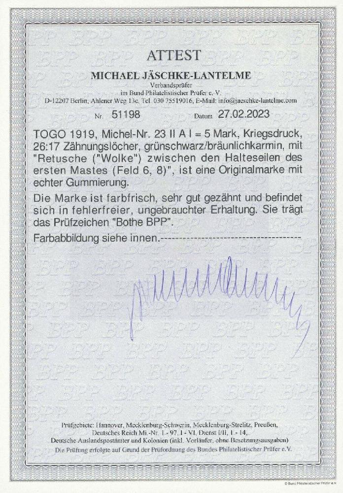 | Zusatzinformationen und Suchstichworte: | Ulrich Felzmann 178. Auktion 22. Juni 2023 Los 2972 Deutsche Kolonien Togo 5 Mk Kriegsdruck mit 26:17 Zähnungslöchern und markanter "Wolken-Retusche" von Feld 6 oder 8, ungebraucht in bestens entfalzter und fehlerfreier Prachterhaltung, farbfrisch und sehr gut gezähnt, sign. Bothe BPP sowie Fotoattest Jäschke-L. BPP, € 500,- Ausruf 200,00 EUR |
