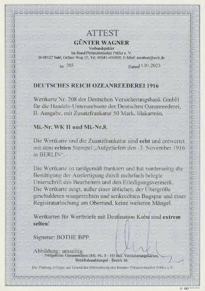 | Prüfgebiet: | Deutsches Reich Schiffspost im Ausland Ozeanreederei 1916/17 |