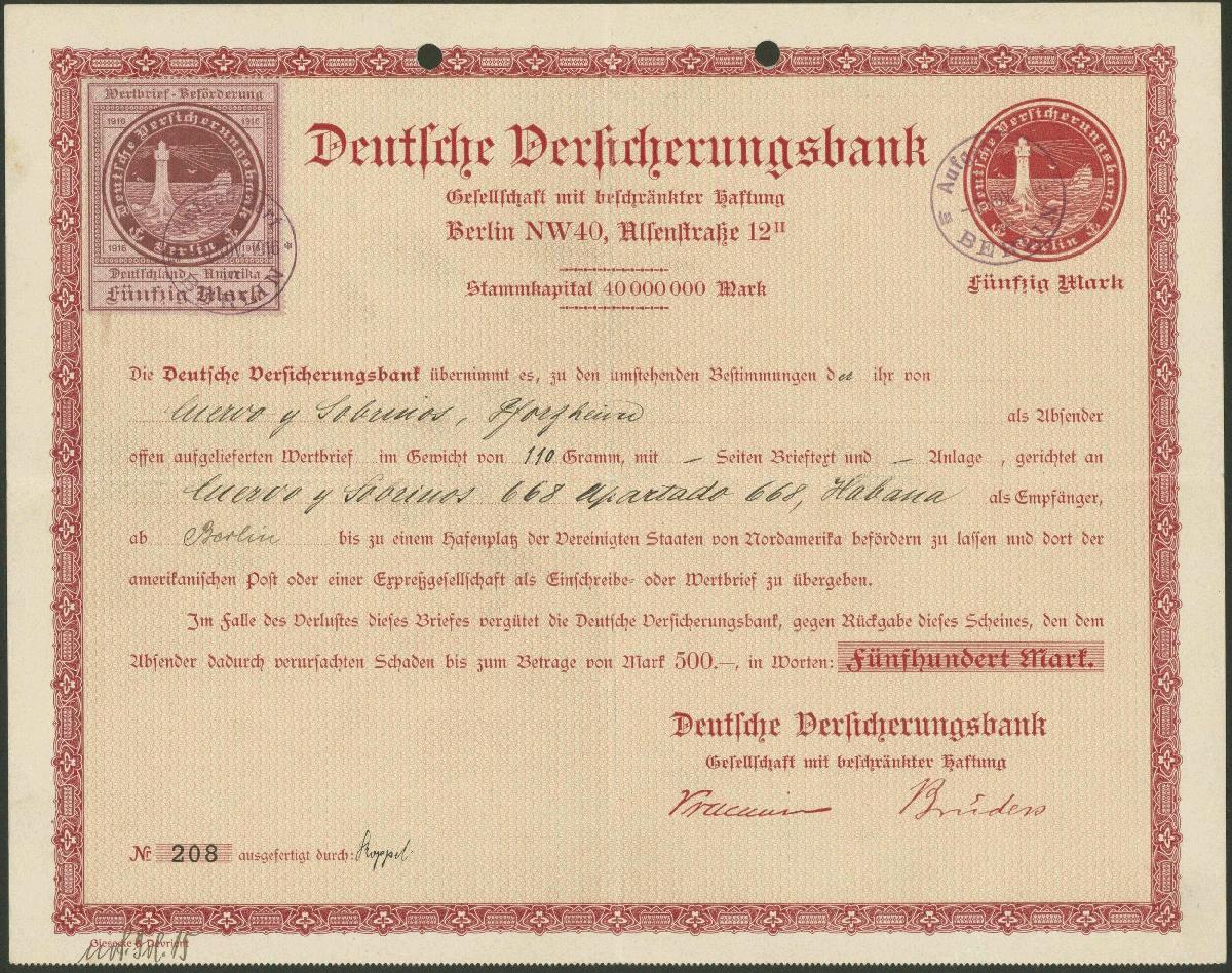 | Zusatzinformationen und Suchstichworte: | Ulrich Felzmann 178. Auktion 22. Juni 2023 Los 3006 Deutsche Kolonien Schiffspost Ozeanreederei 50 Mk "Wertbrief-Beförderung" lilakarmin, tarifrichtige Beifrankatur für einen 110 g schweren Wertbrief auf 50 Mk Wertkarte, gelocht mit üblicher, der Übergröße geschuldeter Faltung, Nr. 208 mit Druckvermerk und sauberen Stempeln "Aufgeliefert in BERLIN den -3. NOV. 1916" und gerichtet an die legendäre Uhrenmanufaktur "Cuervo y Sobrinos" in Habana, Cuba, die heute noch mit Sitz in Lugano, Schweiz, existiert. Signiert Bothe BPP sowie ausführliches Fotoattest Wagner BPP "Wertkarten für Wertbriefe mit Destination Kuba sind extrem selten!" Ausruf 2.500,00 EUR |