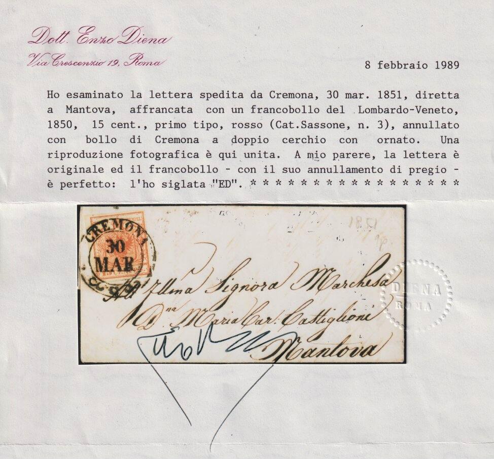| Zusatzinformationen und Suchstichworte: | 182. Laser Invest Auktion - Live Auktion 16. Juni 2023 Los 9 Österreich Lombardei Venetien CREMONA (2CO). Lettera completa del testo spedita a Mantova il 30 marzo 1851 ed affrancata con un francobollo da 15 centesimi annullato con il timbro doppio cerchio ornato usato fino al mese di marzo 1851. Timbro di arrivo al retro. Certificato E. Diena Ausruf 525,00 EUR |