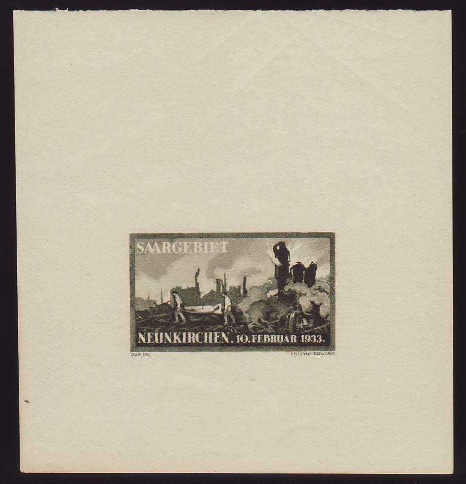 | Zusatzinformationen und Suchstichworte: | Christian E. Geigle Briefmarkenfachhandel Los 0004248107 Saar 1933, Explosionsunglück in Neunkirchen, Farbprobedruck noch ohne Wertangabe auf gummiertem Papier in Schwärzlichgraugrün (Farbgruppe der späteren Marke zu 3 Francs), postfrisches Kabinettstück und nur ein weiterer Farbprobedruck in etwas abweichender Farbe bekannt, unsigniert mit FA Geigle "die Gummierung ist lagerungsbedingt stellenweise leicht vergilbt, weitere Mängel sind nicht vorhanden.". Festpreis 950,00 EUR |