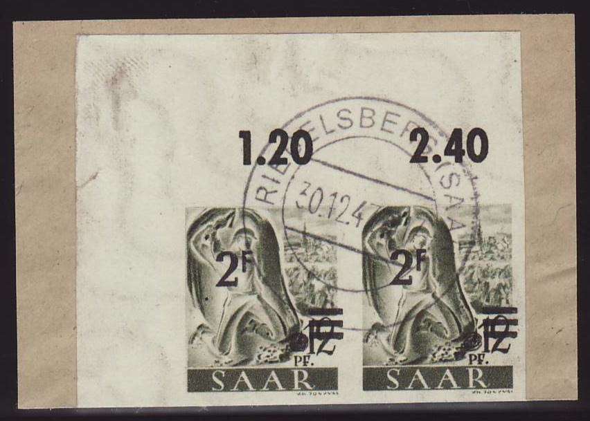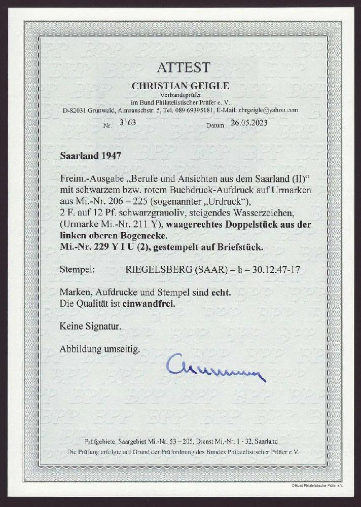 | Zusatzinformationen und Suchstichworte: | Christian E. Geigle Briefmarkenfachhandel Los 0004248116 Saarland 1947, Urdruck, 2 F. auf 12 Pf. schwarzgrauoliv, steigendes Wasserzeichen (sog. "Urdruck"), ungezähntes waagerechtes Paar aus der linken oberen Bogenecke mit glasklarem Stempel "RIEGELSBERG (SAAR) - b - 30.12.47-17" auf hellem Luxusbriefstück (kleiner Einriss im äußersten linken Bogenrand, belanglos), gestempelt sind diese Marken selten, FA Geigle "einwandfrei". Festpreis 1.550,00 EUR |
