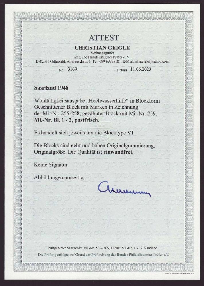 | Zusatzinformationen und Suchstichworte: | Christian E. Geigle Briefmarkenfachhandel Los 0004248121 Saarland 1948, Hochwasserblockpaar, postfrisches Luxusblockpaar (einheitlich Type VI), unsigniert mit FA Geigle "einwandfrei". Festpreis 850,00 EUR |
