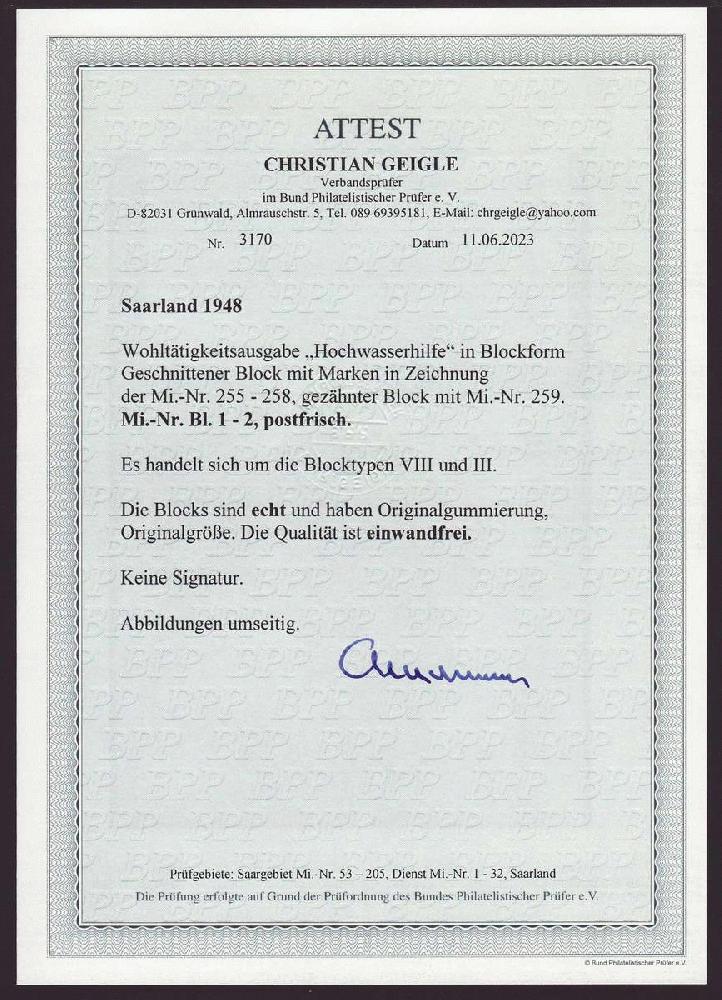 | Zusatzinformationen und Suchstichworte: | Christian E. Geigle Briefmarkenfachhandel Los 0004248122 Saarland 1948, Hochwasserblockpaar, postfrisches Luxusblockpaar (Typen VIII und III), unsigniert mit FA Geigle "einwandfrei". Festpreis 790,00 EUR |