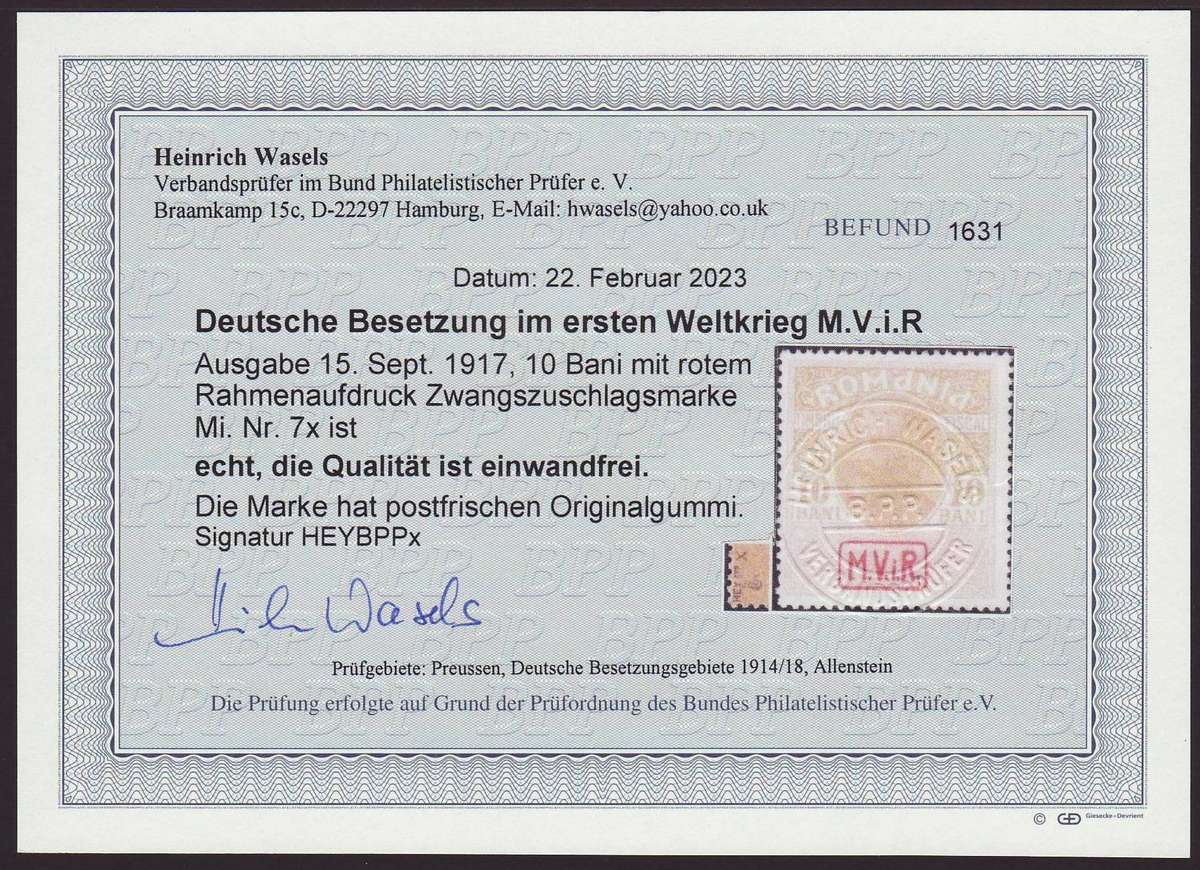 | Zusatzinformationen und Suchstichworte: | Christian E. Geigle Briefmarkenfachhandel Los 0004248098 Deutsche Besetzung I. WK Rumänien 1917, Zwangszuschlagsmarke, 10 Bani gelbbraun auf glänzendem Papier mit dunkelrotem Aufdruck, postfrisches Luxusstück dieser guten Marke, FB Wasels "einwandfrei". Festpreis 175,00 EUR |