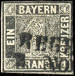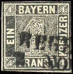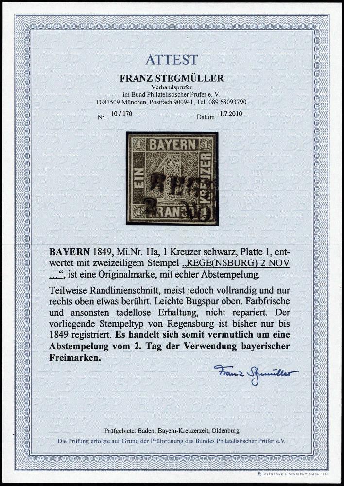 | Zusatzinformationen und Suchstichworte: | DBA Freiburg GmbH Los 1031400156 Altdeutschland Bayern 1849, legendärer "Schwarzer Einser" in der Type "Ia" echt gestempelt mit dem zweizeiligen Langstempel von Regensburg. Aktuelles Farbfotoattest von dem Experten Franz Stegmüller BPP vom 01.07.2010 "... Teilweise Randlinienschnitt, meist jedoch vollrandig und nur rechts oben etwas berührt. Leichte Bugspur oben. Farbfrische und ansonsten tadellose Erhaltung, nicht repariert. Der vorliegende Stempeltyp von Regensburg ist bisher nur bis 1849 registriert. Es handelt sich somit vermutlich um eine Abstempelung vom 2. Tag der Verwendung bayerischer Freimarken ... " Festpreis 2.800,00 EUR |