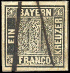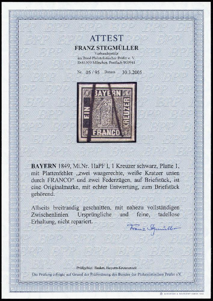 | Zusatzinformationen und Suchstichworte: | DBA Freiburg GmbH Los 1031400154 Altdeutschland Bayern 1849, legendärer "Schwarzer Einser" in der Type "Ia" echt gestempelt mit zwei Federzügen auf Briefstück mit dem Plattenfehler "zwei waagerechte, weiße Kratzer unten durch Franco" in Luxuserhaltung. Farbfotoattest von dem Experten Franz Stegmüller BPP "... Allseits breitrandig geschnitten, mit nahezu vollständigen Zwischenlinien. Ursprüngliche und feine, tadellose Erhaltung, nicht repariert ....". Festpreis 1.800,00 EUR |