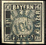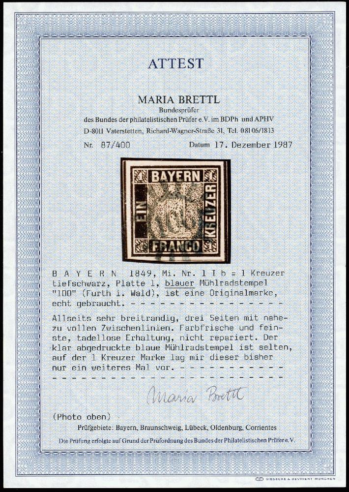 | Zusatzinformationen und Suchstichworte: | DBA Freiburg GmbH Los 1031200105 Altdeutschland Bayern 1849, legendärer "Schwarzer Einser" in der besseren Type "Ib" echt gestempelt mit dem seltenen blauen Mühlradstempel von Furth i. Wald. Farbfotoattest von der Expertin Maria Brettl BPP "... Allseits sehr breitrandig, drei Seiten mit nahezu vollen Zwischenlinien. Farbfrische und feinste, tadellose Erhaltung, nicht repariert. Der klar abgedruckte blaue Mühlradstempel ist selten, auf der 1 Kreuzer Marke lag mir dieser bisher nur ein weiteres Mal vor ... ". Extrem selten in dieser tadellosen Erhaltung! Festpreis 10.000,00 EUR |
