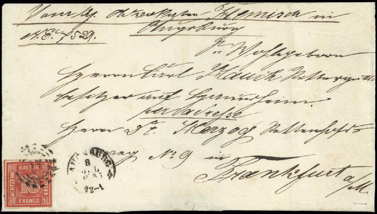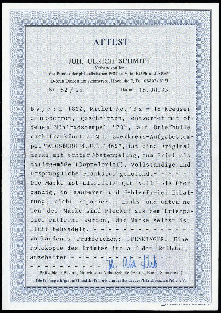 | Zusatzinformationen und Suchstichworte: | DBA Freiburg GmbH Los 1444400571 Altdeutschland Bayern 1862, 18 Kreuzer Freimarke Wertziffer mit offenem Mühlradstempel "28" von Augsburg als Einzelfrankatur auf portogerechtem Doppelbrief nach Frankfurt. Farbfotoattest des Experten Ulrich Schmitt BPP " .... Die Marke ist allseitig gut voll- bis überrandig, in sauberer und fehlerfreier Erhaltung .... Links und unten neben der Marke sind Flecken aus dem Briefpapier entfernt worden, die Marke selbst ist nicht behandelt .... " Festpreis 1.500,00 EUR |