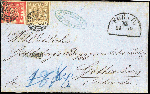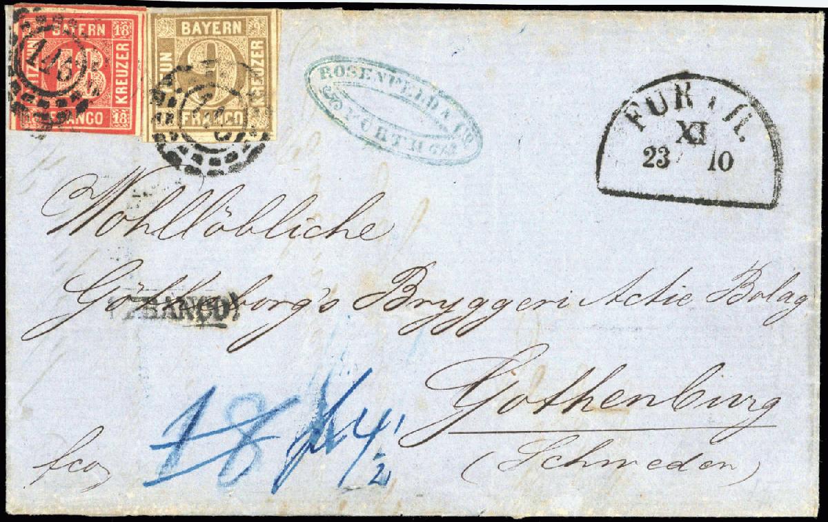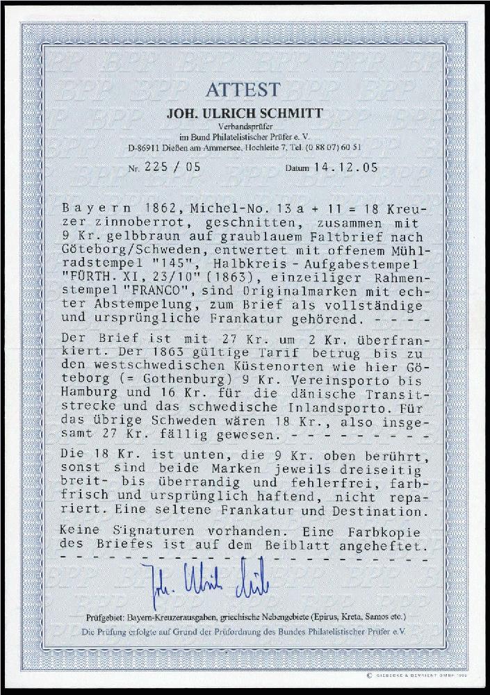 | Zusatzinformationen und Suchstichworte: | DBA Freiburg GmbH Los 1031400159 Altdeutschland Bayern 1862, 18 und 9 Kreuzer Freimarken Wertziffer mit offenem Mühlradstempel "145" entwertet, zusammen auf leicht überfrankiertem Brief von Fürth nach Göteborg/Schweden. Farbfotoattest des Experten Ulrich Schmitt BPP " .... Die 18 Kreuzer ist unten, die 9 Kreuzer oben berührt, sonst sind beide Marken jeweils dreiseitig, breit- bis überrandig und fehlerfrei, farbfrisch und ursprünglich haftend ... Eine seltene Frankatur und Destination ... " Festpreis 3.500,00 EUR |