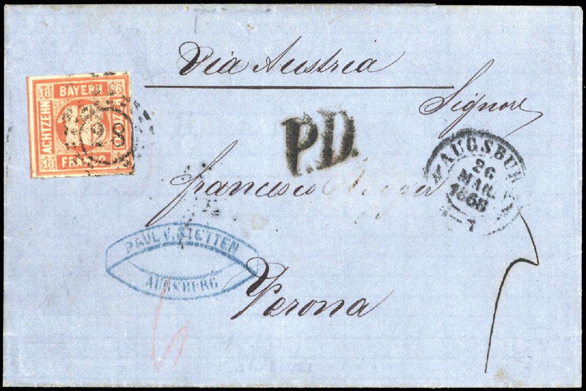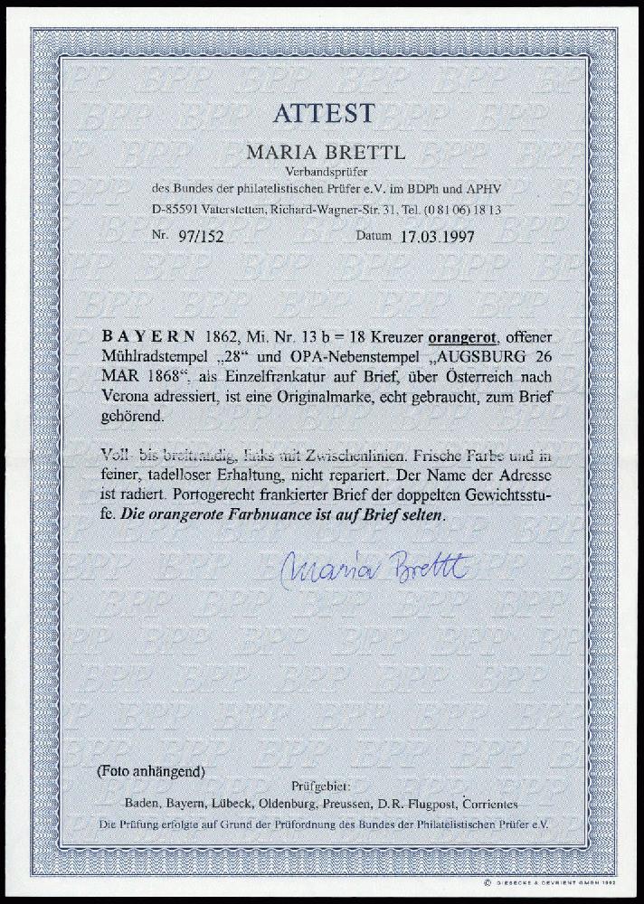 | Zusatzinformationen und Suchstichworte: | DBA Freiburg GmbH Los 1444400570 Altdeutschland Bayern 1862, 18 Kreuzer Freimarke Wertziffer in der guten Farbe "b" als Einzelfrankatur mit offenem Mühlradstempel "28" von Augsburg nach Verona adressiert. Farbfotoattest von der Expertin Maria Brettl BPP "... Voll- bis breitrandig, links mit Zwischenlinien. Frische Farbe und in feiner, tadelloser Erhaltung, nicht repariert. Der Name der Adresse ist radiert. Portogerecht frankierter Brief der doppelten Gewichtsstufe. Die orangerote Farbnuance ist auf Brief selten ...... " Festpreis 1.500,00 EUR |