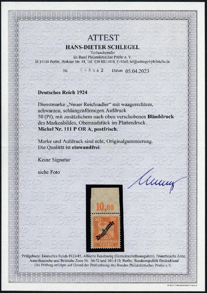 | Zusatzinformationen und Suchstichworte: | DBA Freiburg GmbH Los 1444400507 Deutsches Reich 1924, 50 Pfg. Dienstmarke Reichsadler als nicht durchgezähntes Platten- Oberrandstück in postfrischer Luxusqualität zudem mit der Besonderheit "verschobener Blinddruck des Markenbildes". Im Michel-Spezial 2023 ist dieser Blinddruck nicht einmal bei der Urmarke notiert! Aktuelles Farbfotoattest Schlegel BPP vom 05.04.2023 "...echt und einwandfrei ....". Eine äußerst außergewöhnliche Kombination! Festpreis 1,500,00 EUR |
