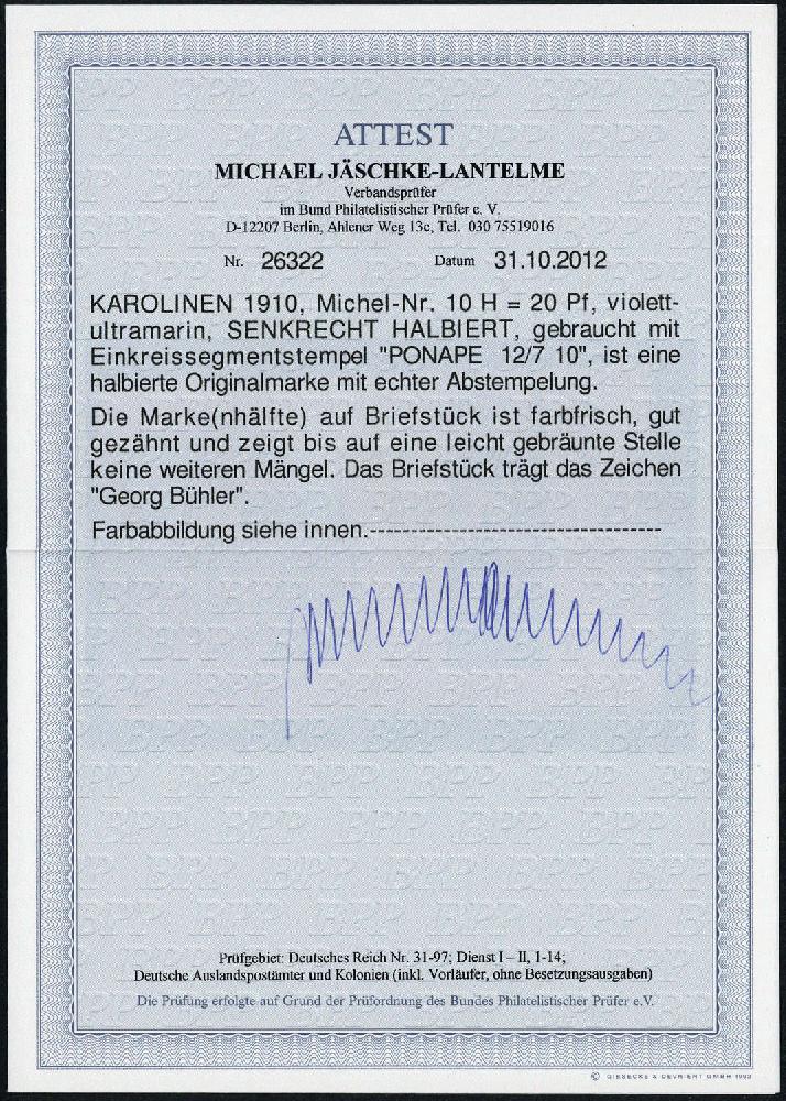 | Zusatzinformationen und Suchstichworte: | DBA Freiburg GmbH Los 1021800070 Deutsche Kolonien Karolinen 1910, 20 Pfg. Kaiseryacht-Halbierung als 3. Ponape- Provisorium auf Briefstück mit danebengesetztem Dienstsiegel. Signiert und aktuelles Farbfotoattest von dem Experten Jäschke- Lantelme BPP vom 31.10.2012 "... Die Markenhälfte auf Briefstück ist farbfrisch, gut gezähnt und zeigt bis auf eine leicht gebräunte Stelle keine weiteren Mängel .... ". Festpreis 1.500,00 EUR |