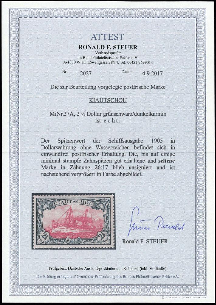 | Zusatzinformationen und Suchstichworte: | DBA Freiburg GmbH Los 1021200133 Deutsche Kolonien Kiautschou 1905, 2 1/2 Dollar Kaiseryacht ohne Wasserzeichen in postfrischer Luxuserhaltung, aktuelles Farbfotoattest Steuer BPP vom 04.09.2017 "....echt .... in einwandfreier postfrischer Erhaltung ... eine seltene Marke .... " (ME 5.000.-) Festpreis 2.800,00 EUR |