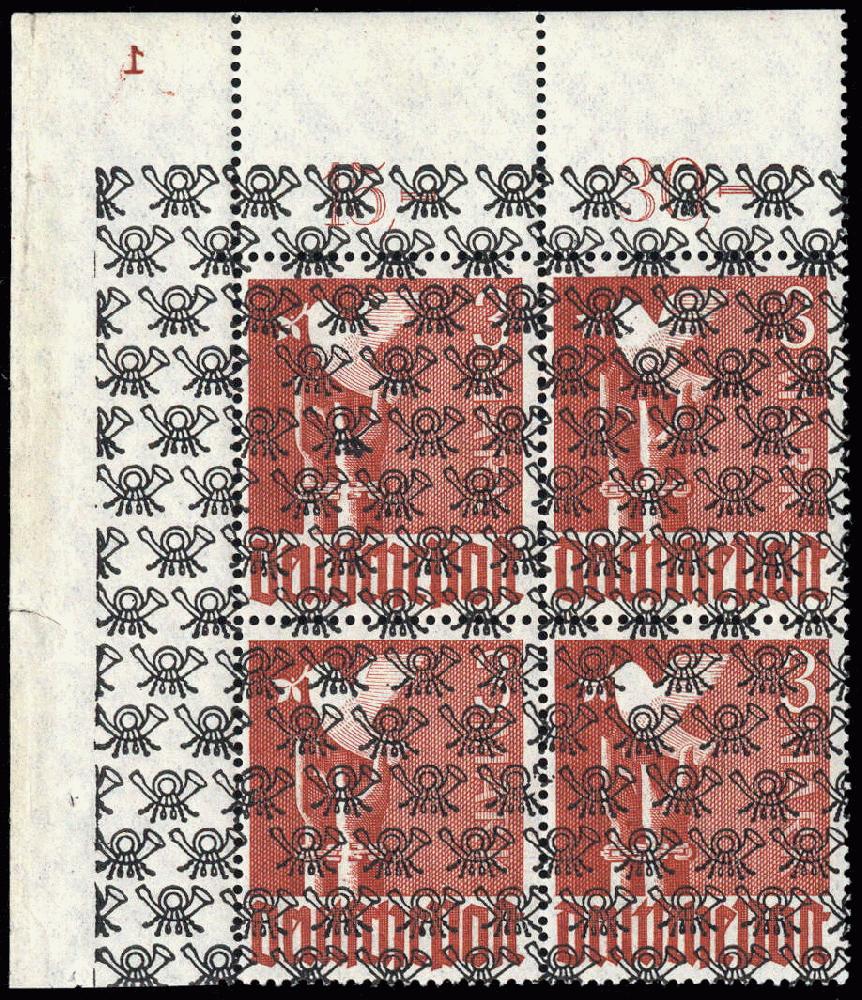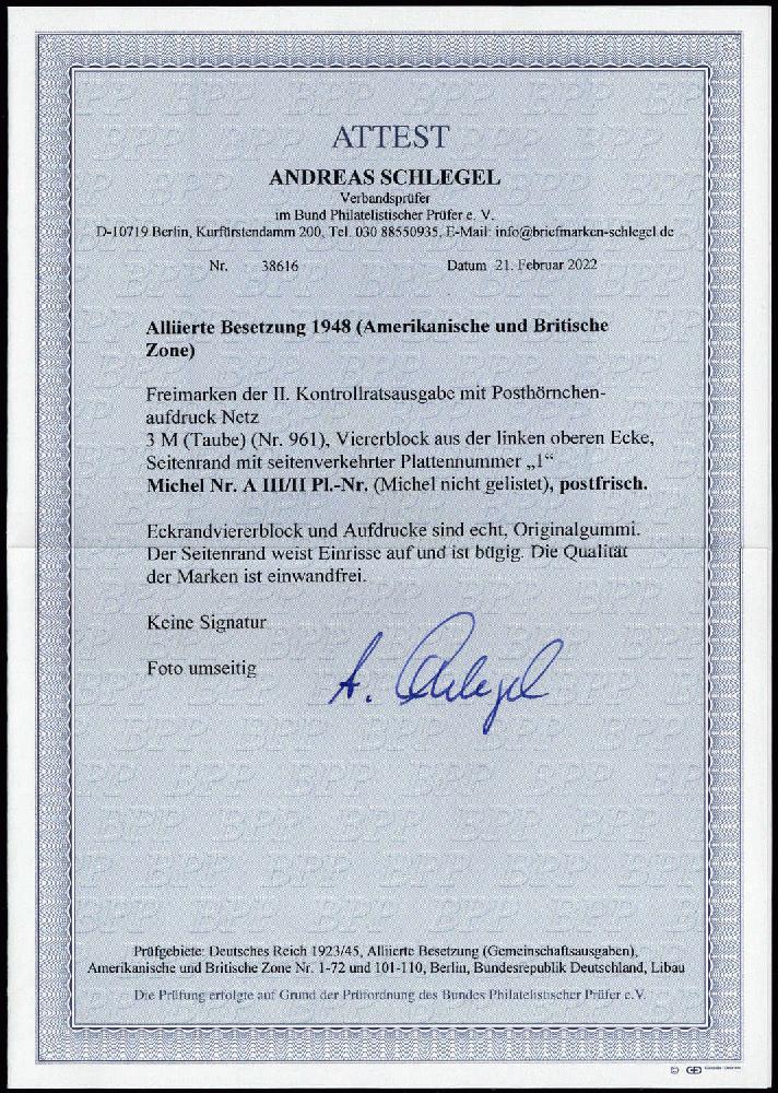 | Zusatzinformationen und Suchstichworte: | DBA Freiburg GmbH Los 1444400370 D Bizone 1948, 3.- Mark Friedenstaube mit echtem Netzaufdruck als postfrischer durchgezähnter Platten- Eckrand 4-er Block l.o. mit der seltenen Plattennummer "1". Der breite Seitenrand weist ganz außen Einrisse auf und ist bügig, aktuelles Farbfotoattest Schlegel BPP vom 21.02.2022 "..... echt,,, Die Qualität der Marken ist einwandfrei ....". Die Plattennummer kommt nur in einer kleinen Teilauflage vor! Im Michel- Spezial 2021 ist diese Plattennummer gar nicht gelistet! Festpreis 1.500,00 EUR |