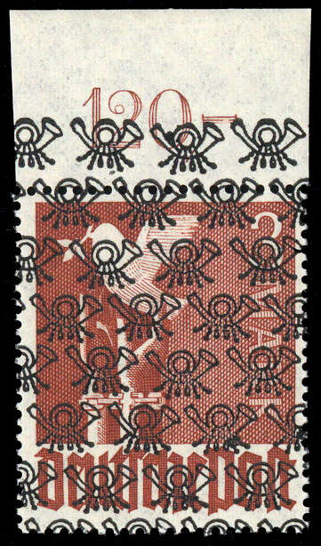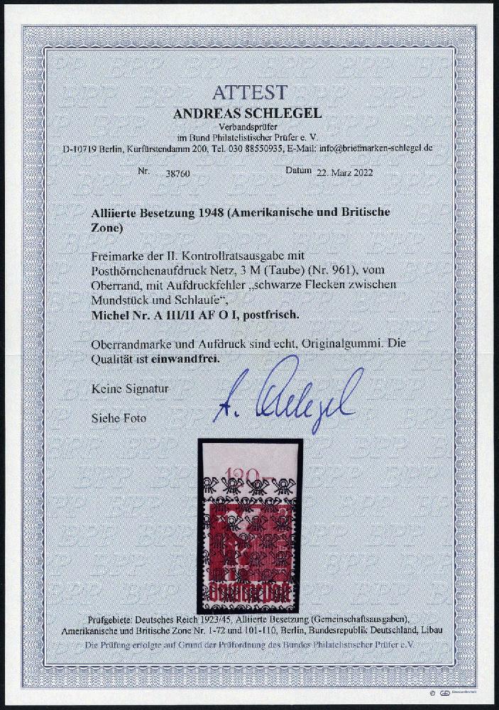 | Zusatzinformationen und Suchstichworte: | DBA Freiburg GmbH Los 1444400391 D Bizone 1948, 3.- Mark Friedenstaube mit echtem Netzaufdruck als postfrisches nicht durchgezähntes Luxus- Platten- Oberrandstück mit zusätzlich dem Aufdruckfehler "schwarze Flecken zwischen Mundstück und Schlaufe", aktuelles Farbfotoattest Schlegel BPP vom 22.03.2022 in der höchsten Qualitätsstufe "echt und einwandfrei". Eine außergewöhnliche Kombination, im Michel- Spezial 2021 ohne Preisnotierung! (ME -.-) Festpreis 1.490,00 EUR |